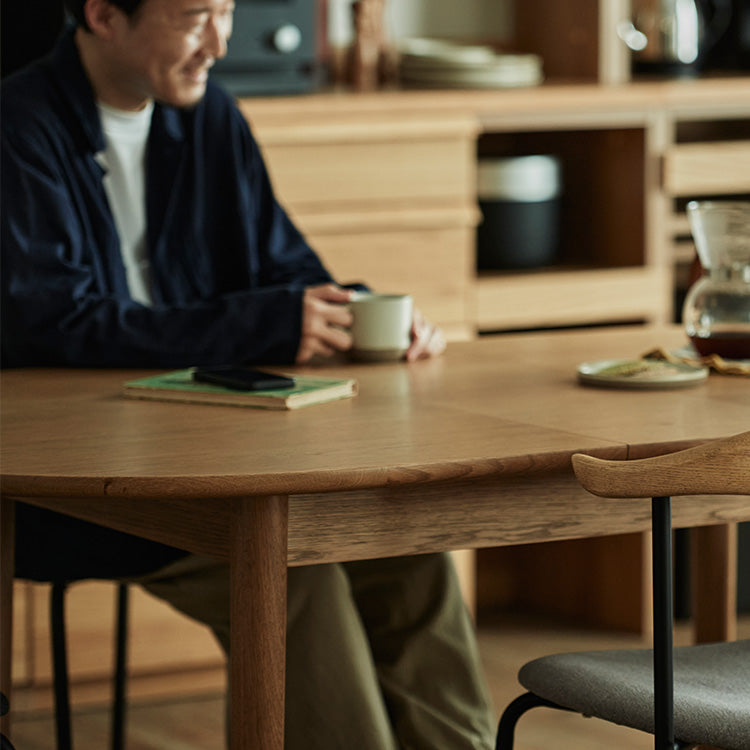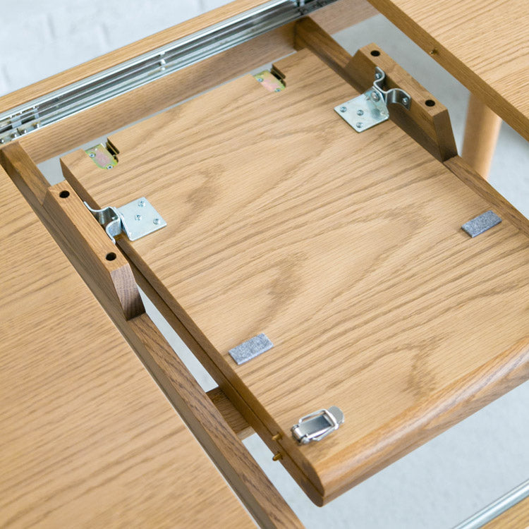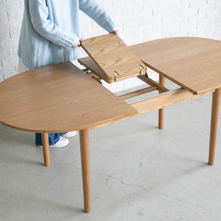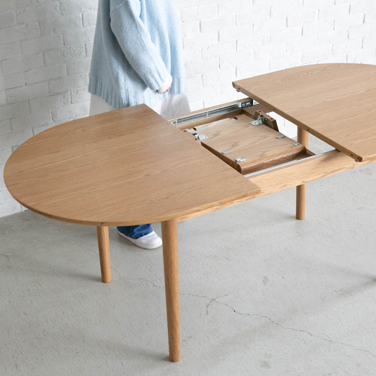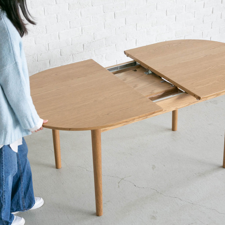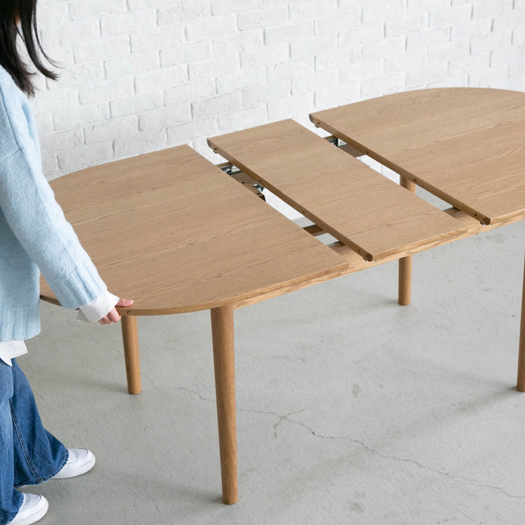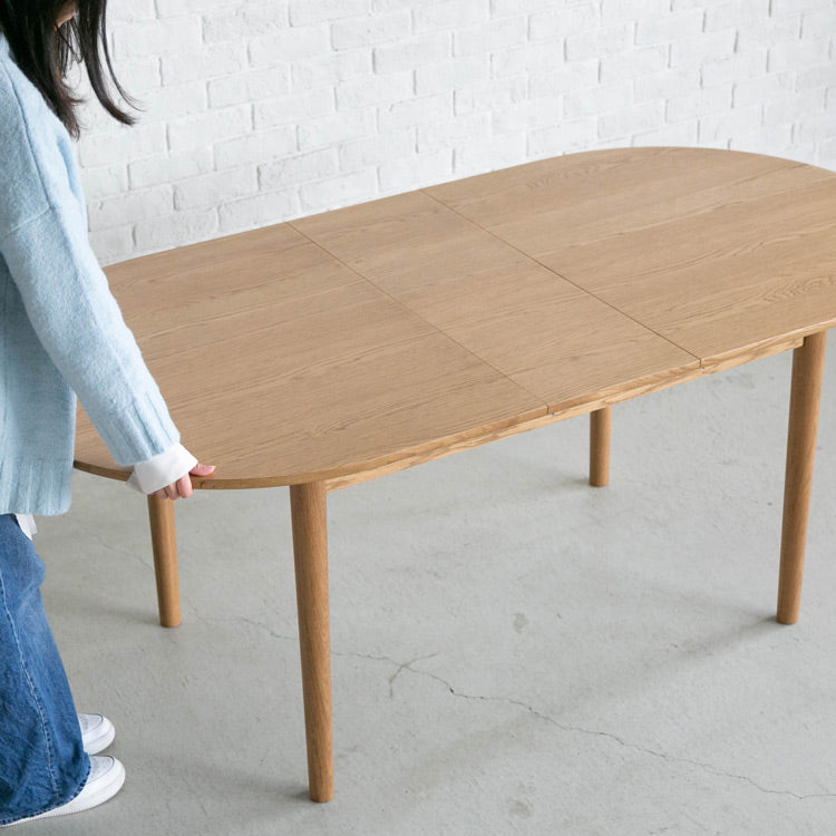 | 商品情報 | 面取りした柔らかいナチュラルな雰囲気が特徴のダイニングテーブルです。テーブルの端を引いて、中央から天板を取り出し伸長することができます。来客がある際など用途に合わせて伸長させてください。 |