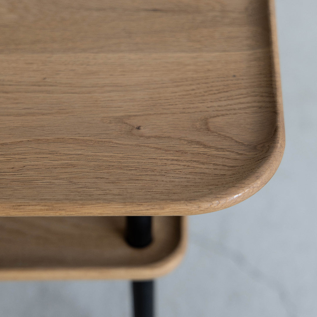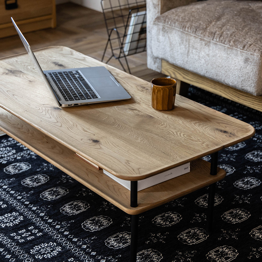 | 商品情報 | 優しい風合いのオーク材と締め色のブラックスチールを使用した、2段式のコーヒーテーブル。 中棚には、手元にあると便利なものを手軽に置けます。シンプルなデザインは、ジャンルを問わずどんなテイストの部屋ともマッチします。 |