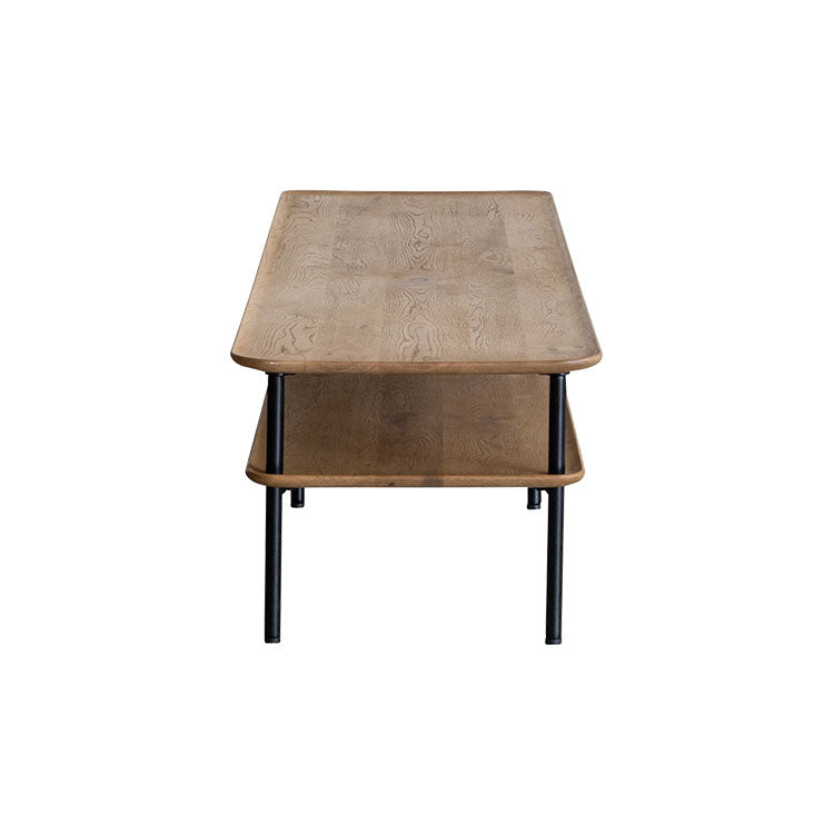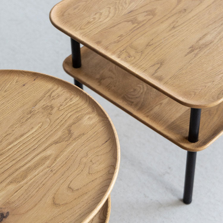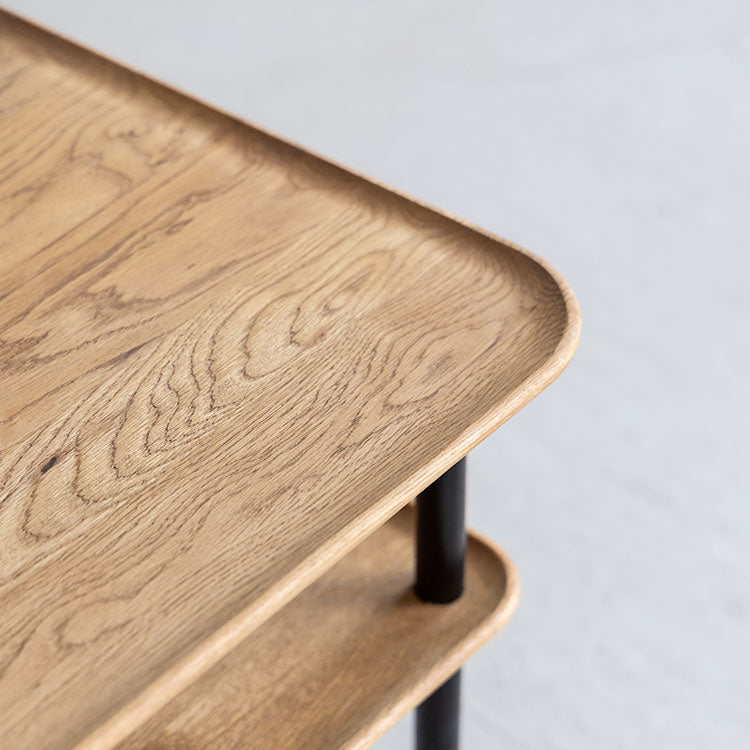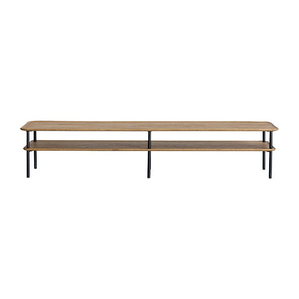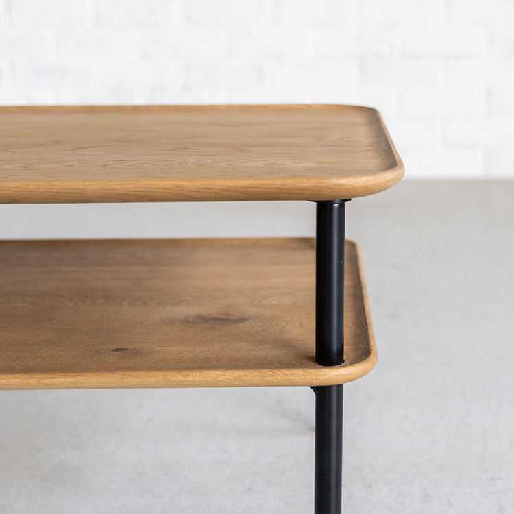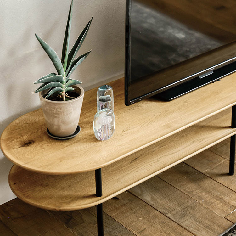 | 商品情報 | 優しい風合いのオーク材と締め色のブラックスチールを使用した、2段式のテレビボード。中棚は使い勝手のいいオープン収納で、AV機器や本など自由に置くことができます。シンプルなデザインは、ジャンルを問わずどんなテイストの部屋ともマッチします。 |