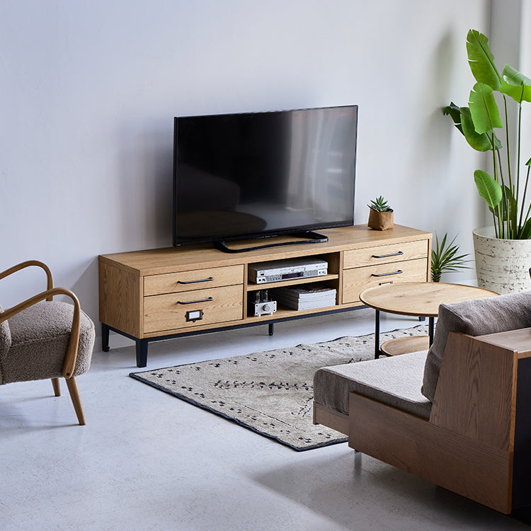 | 商品情報 | ナチュラルで優しい風合いのオーク材を使用したテレビボード。 細長い無骨なスチールをポイント使いすることで、素材感がありながら品のあるデザインにまとめ上げています。 大小の引出しと可動棚板のオープンデザインは、機能的で空間にほどよい抜け感を与えます。 |
