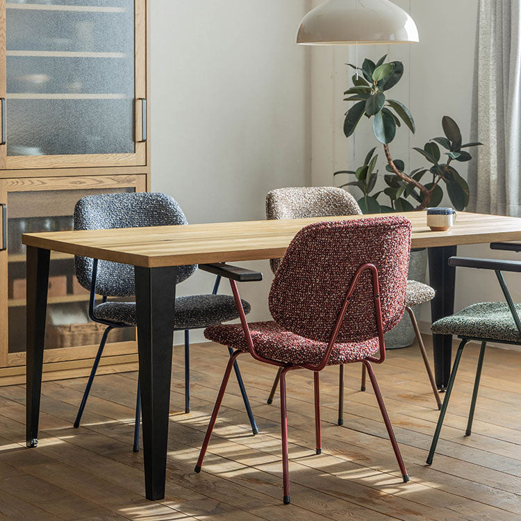 商品情報 ミッドセンチュリーデザインをベースにしたチェア。当時をイメージしたレトロさ とモダンな雰囲気を取り入れました。エッジの効いたスチール脚と木製の肘 置き、背のパイピングなど細部のディティールもこだわっています。背と座の シートが優しくしっかりとホールドしてくれる座り心地です。