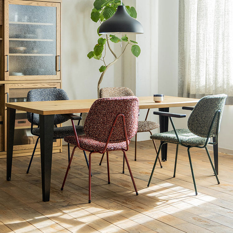 | 商品情報 | ミッドセンチュリーデザインをベースにしたチェア。当時をイメージしたレトロさ とモダンな雰囲気を取り入れました。エッジの効いたスチール脚と木製の肘 置き、背のパイピングなど細部のディティールもこだわっています。背と座の シートが優しくしっかりとホールドしてくれる座り心地です。 |