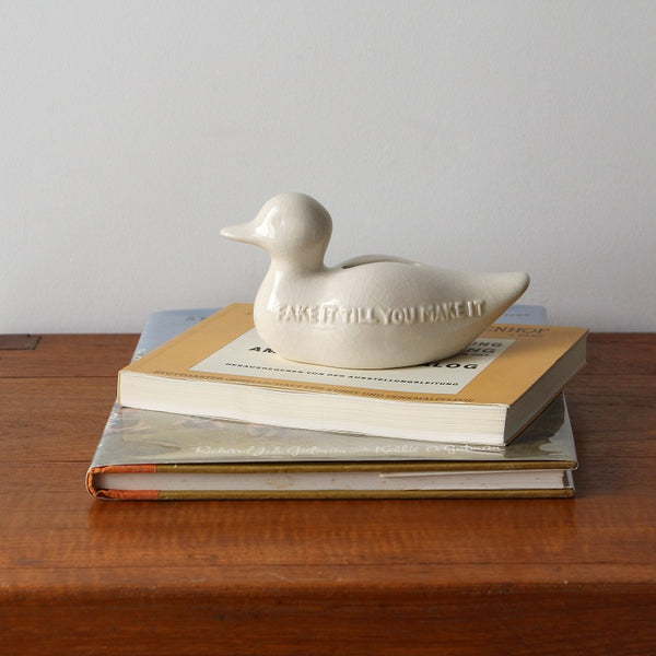 鴨をモチーフとした貫入仕上げの陶器製貯金箱。