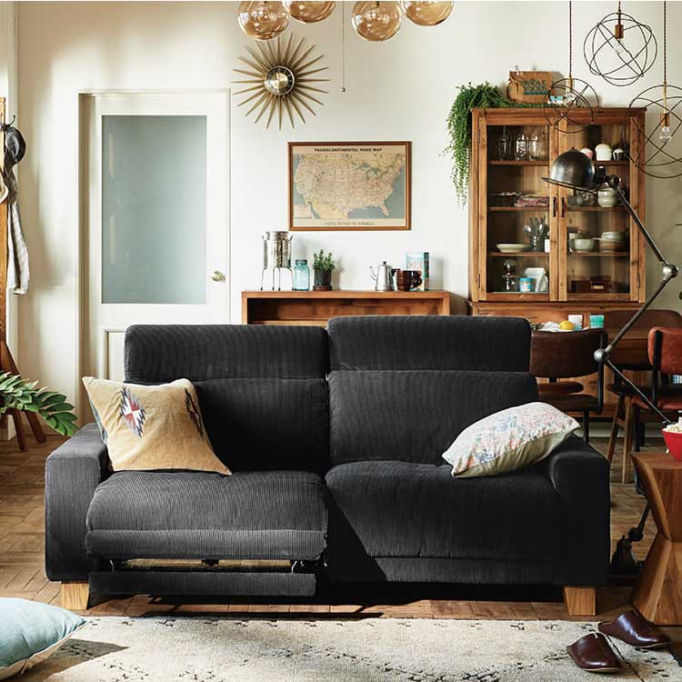 | 商品情報 | 肘横のスイッチでリクライニングができるソファです。フッドレストのリクライニングはスマートな巻き込み式を採用しました。クッションにはフェザーがたっぷり入っているので、包み込まれるような柔らかな座り心地でゆったりとくつろぐことができます。 |