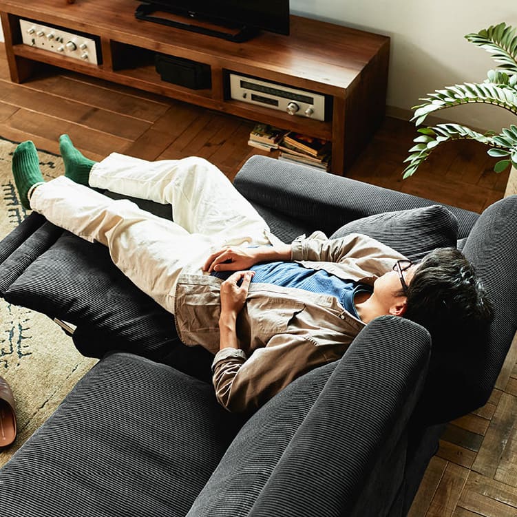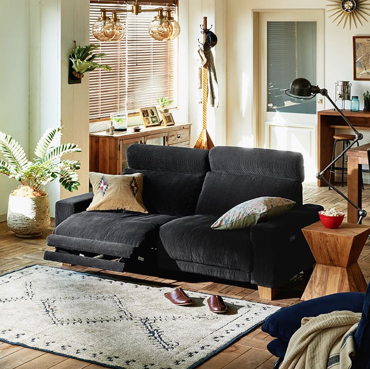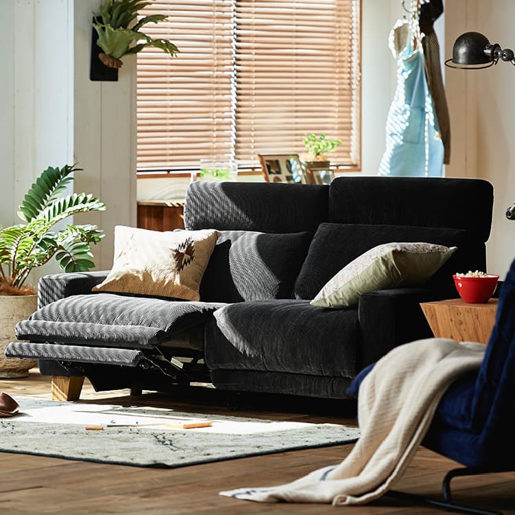 | 商品情報 | 肘横のスイッチでリクライニングができるソファです。フッドレストのリクライニングはスマートな巻き込み式を採用しました。クッションにはフェザーがたっぷり入っているので、包み込まれるような柔らかな座り心地でゆったりとくつろぐことができます。 |