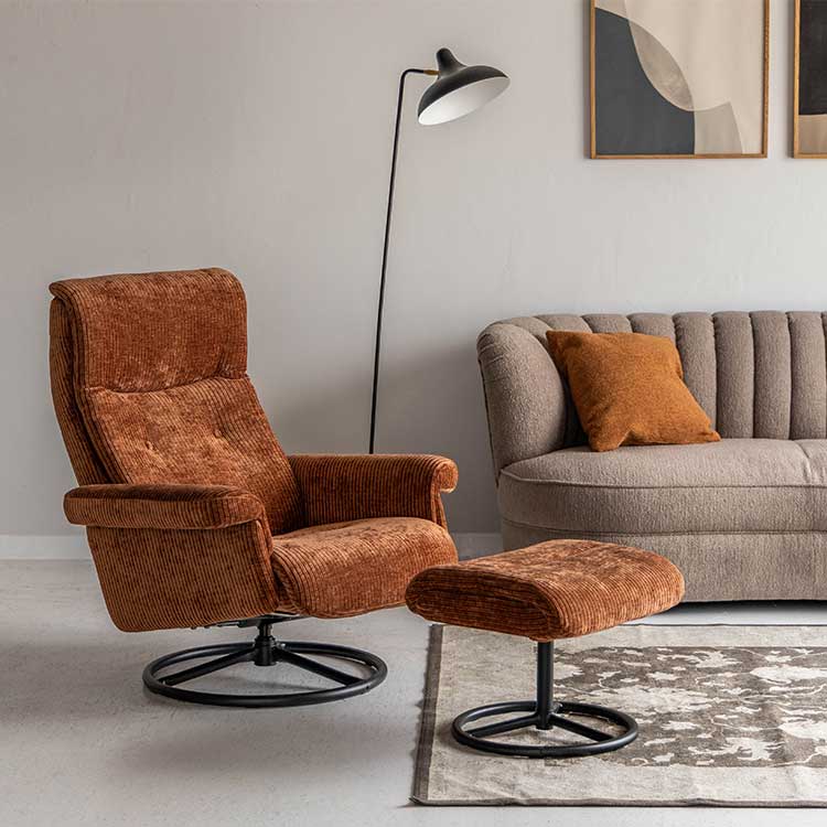 商品情報 レバー操作による手動リクライニングにより、長時間快適な姿勢で過ごすことができるリクライナーソファ。 太い畝のジャガード生地を使用することで、 インダストリアルやヴィンテージといった空間を演出します。