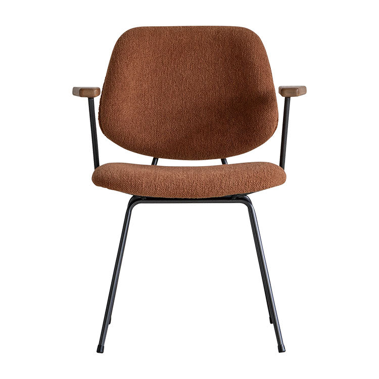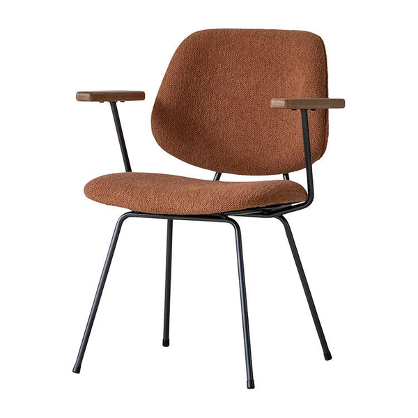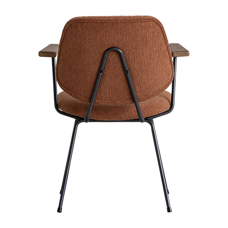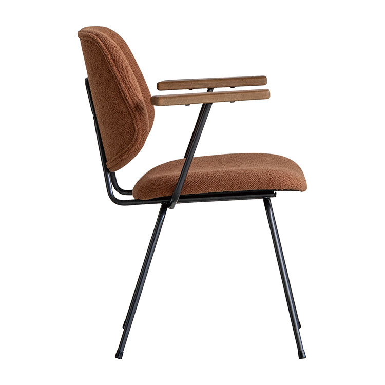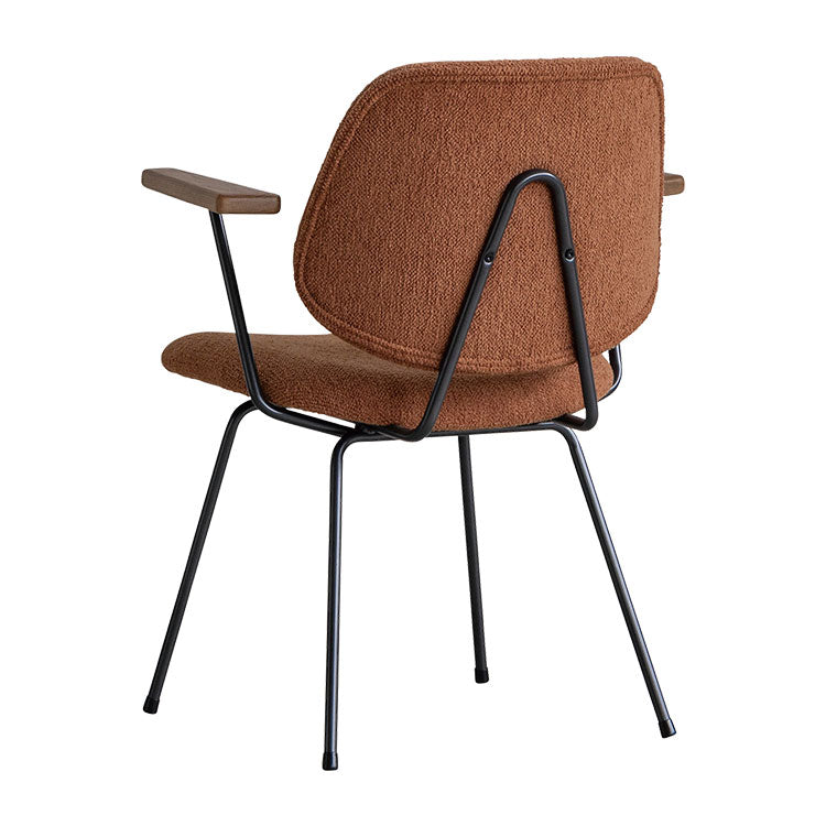 | 商品情報 | ミッドセンチュリーデザインをベースにしたチェア。当時をイメージしたレトロさ とモダンな雰囲気を取り入れました。エッジの効いたスチール脚と木製の肘 置き、背のパイピングなど細部のディティールもこだわっています。背と座の シートが優しくしっかりとホールドしてくれる座り心地です。 |