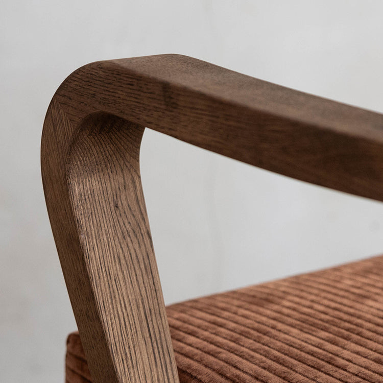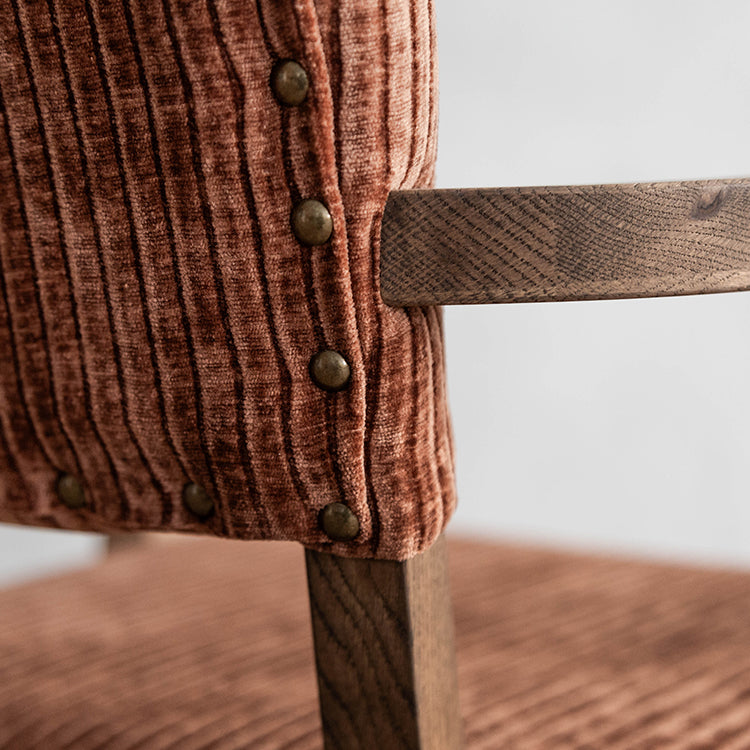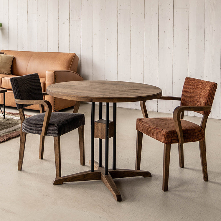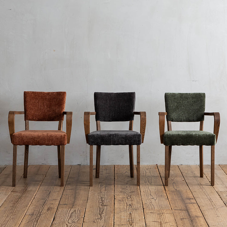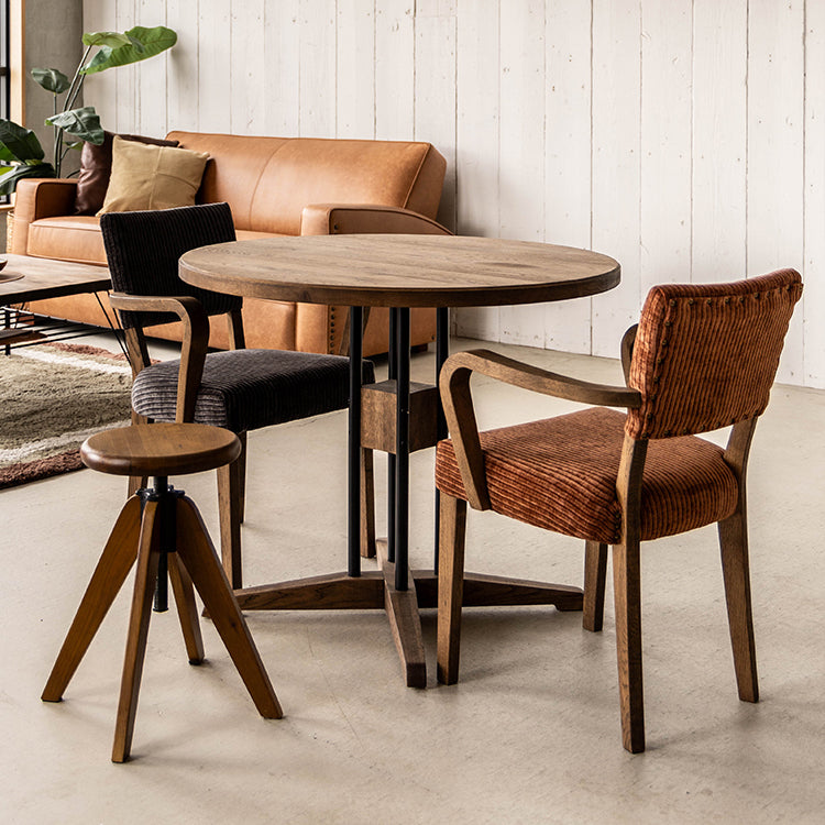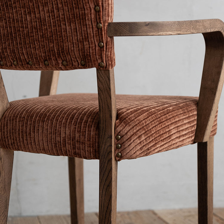 商品情報 シンプルなフォルムに、背面に施された鋲と曲線を描く肘のデザインがアクセントになっています。ヴィンテージ感のあるミドルブラウンの木フレームが素朴で無骨な雰囲気を演出します。