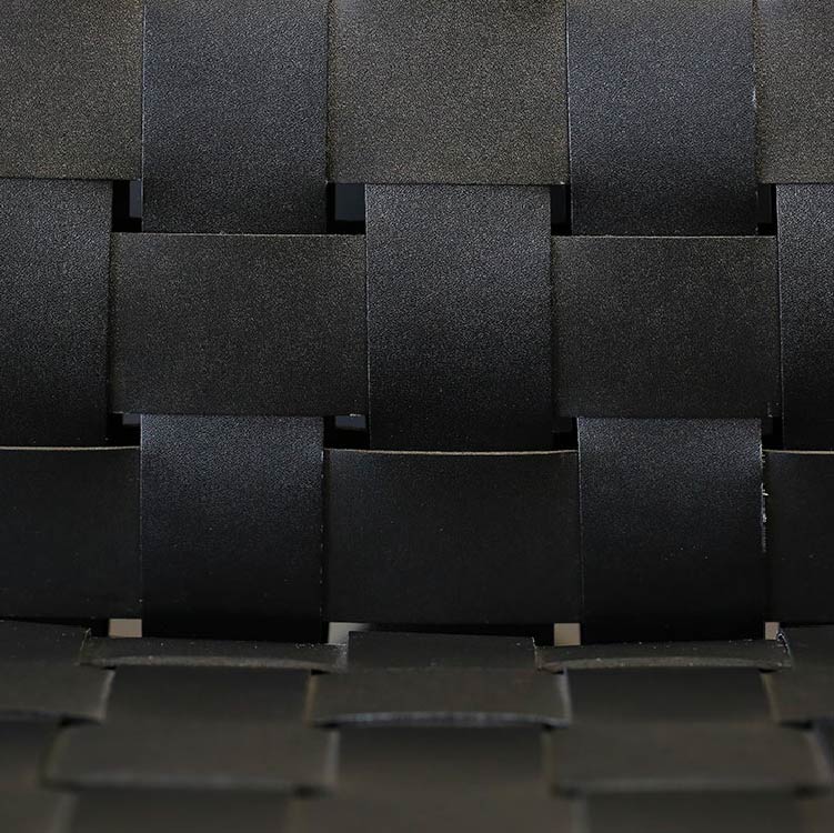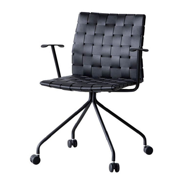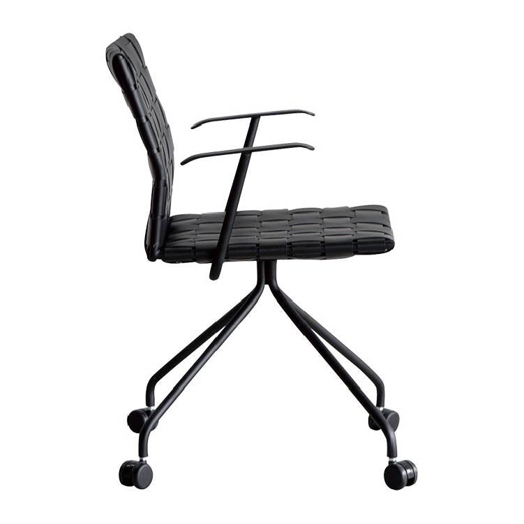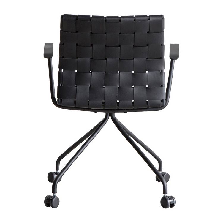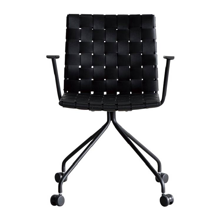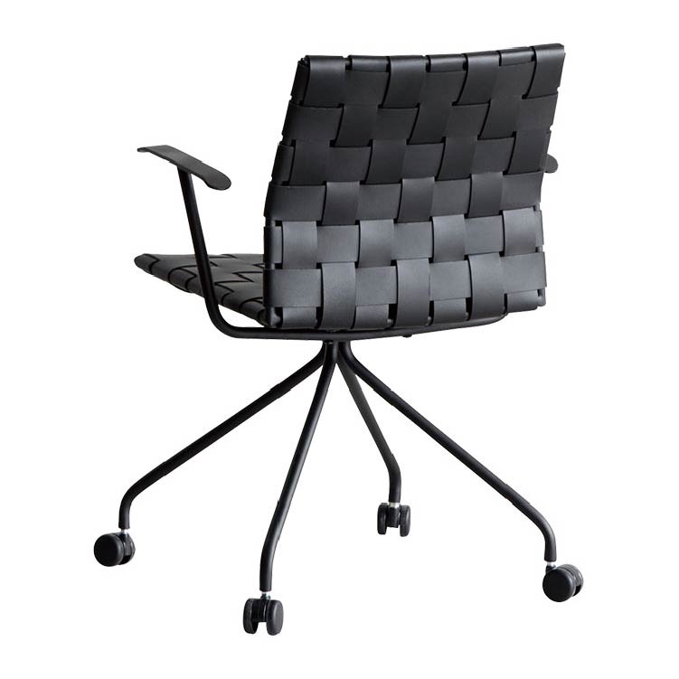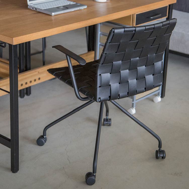商品情報 レザーを編みこんだ座面とスチールフレームで構成された、モダンな キャスター付きのデスクチェアです。ボンデッドファイバーは、革の端材等 をほぐして樹脂で固めて再生成した、天然皮革の雰囲気が味わえつ つも、素材も無駄にしないエコロジーな素材です。