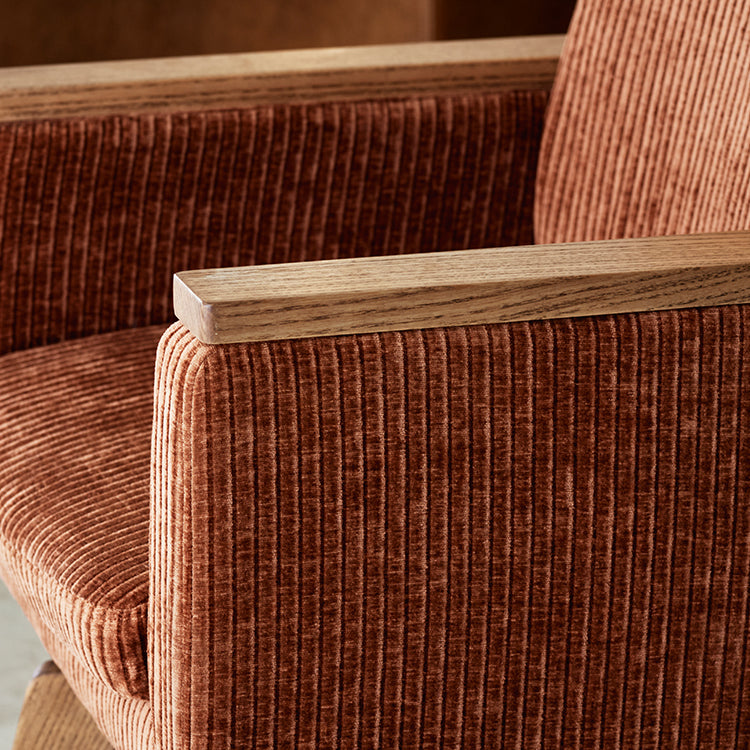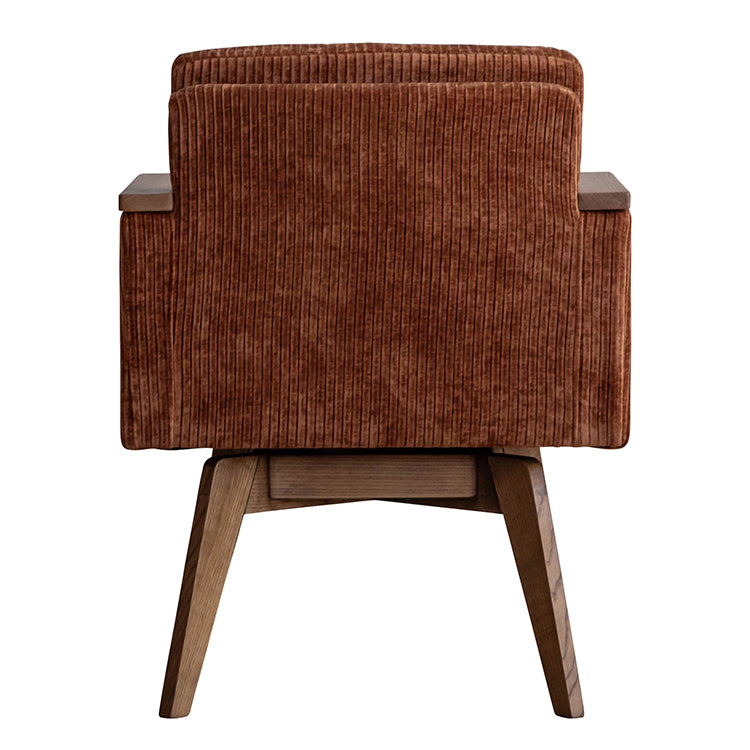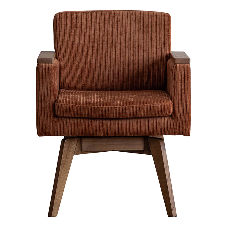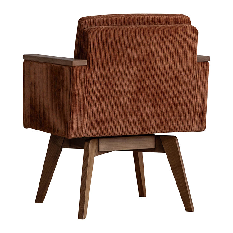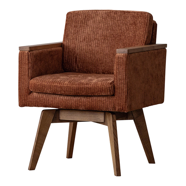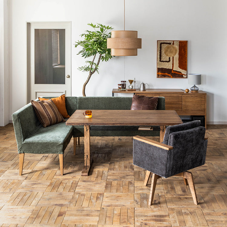 | 商品情報 | 落ち着いたカラーの張地と木脚を組み合わせたヴィンテージシックな雰囲気に、すっきりとしたモダンさもあるデザインの回転チェアです。座面が回転することで、座ったまま体の向きを変えられるので場所を取らずにスムーズな立ち座りが可能です。肘付きでゆったりと寛ぐことができます。 |