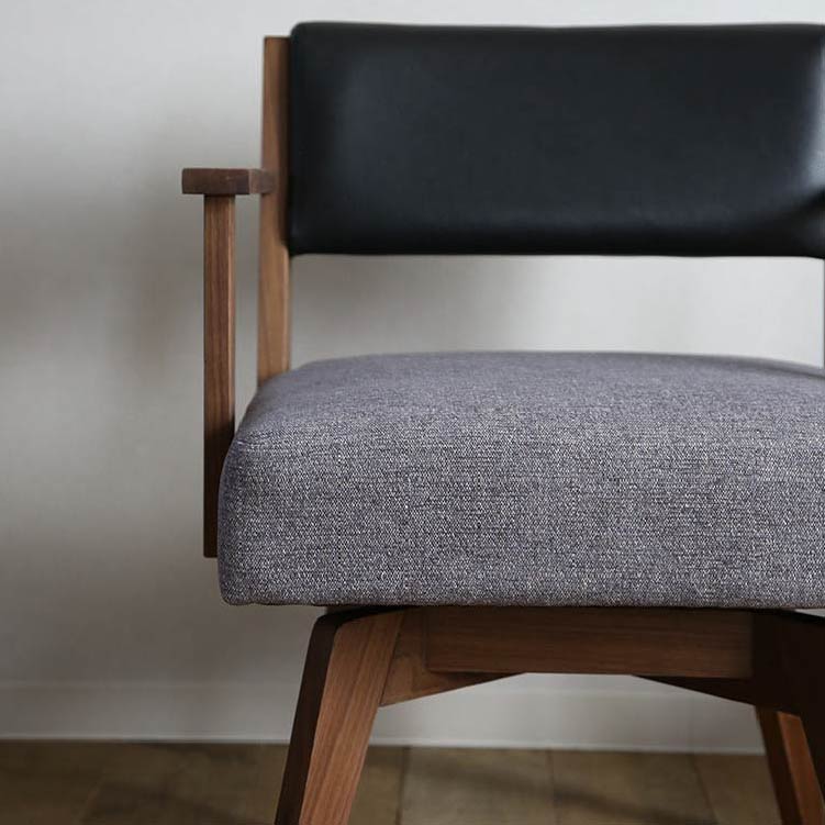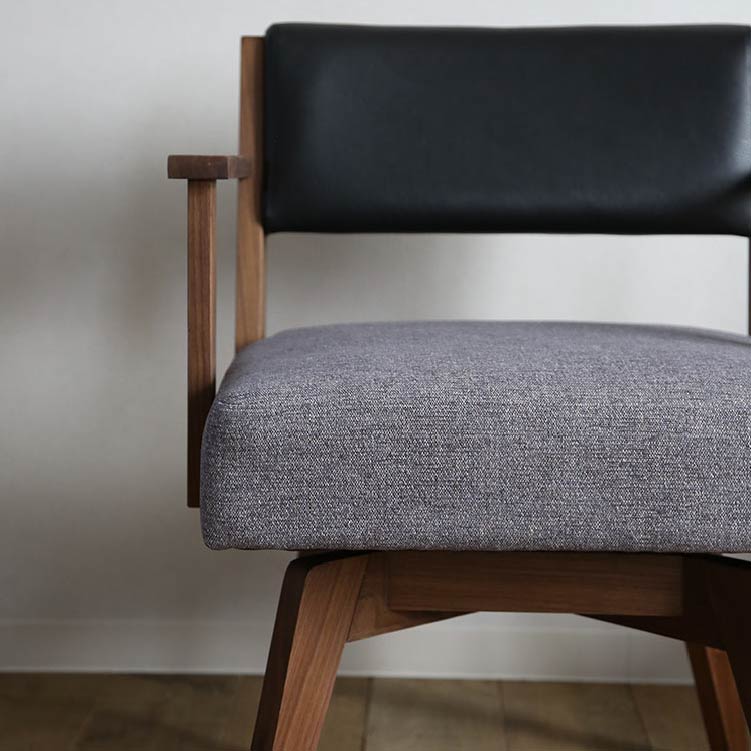 商品情報 カインテーブルに合わせられる回転式のチェアです。肘付と肘無の2種類、 張地は単色と2トーンの2パターンをお選びいただけます。