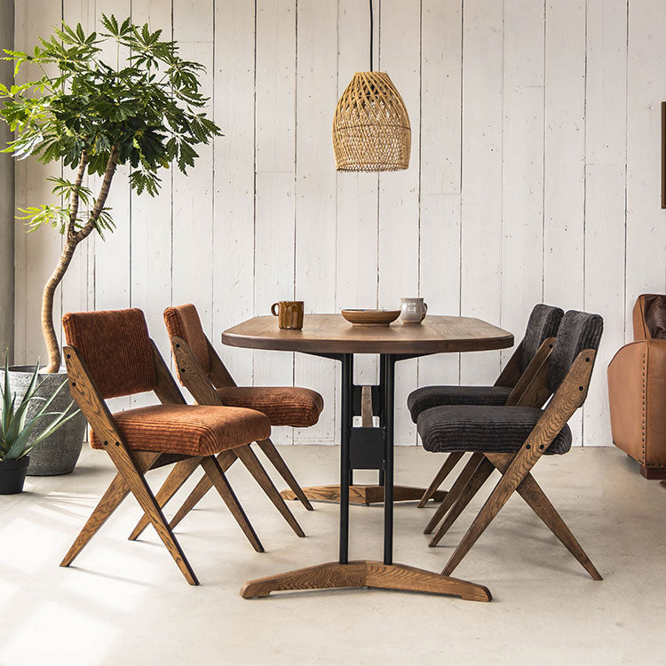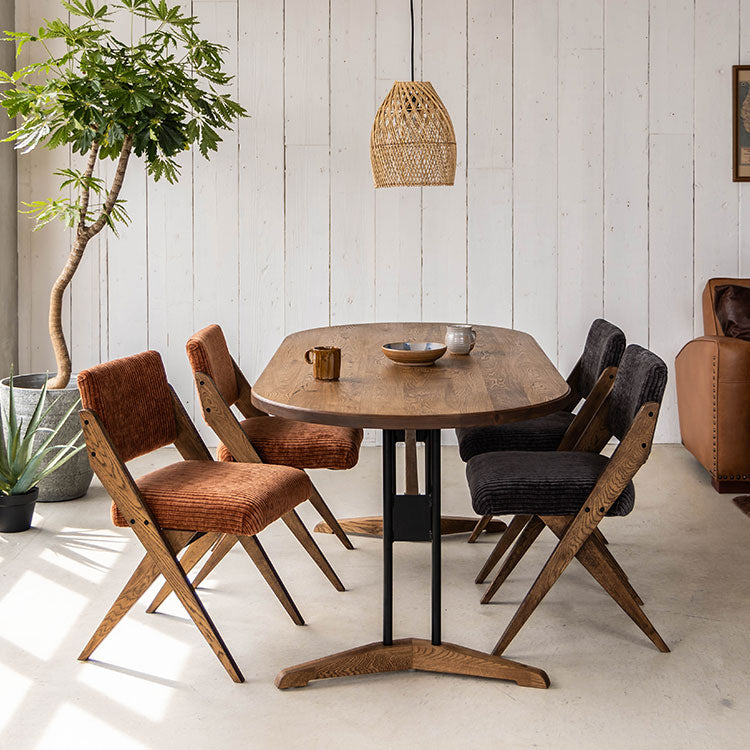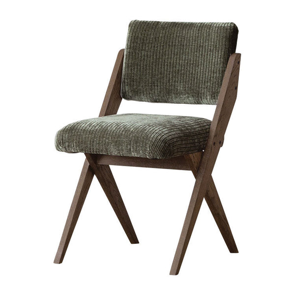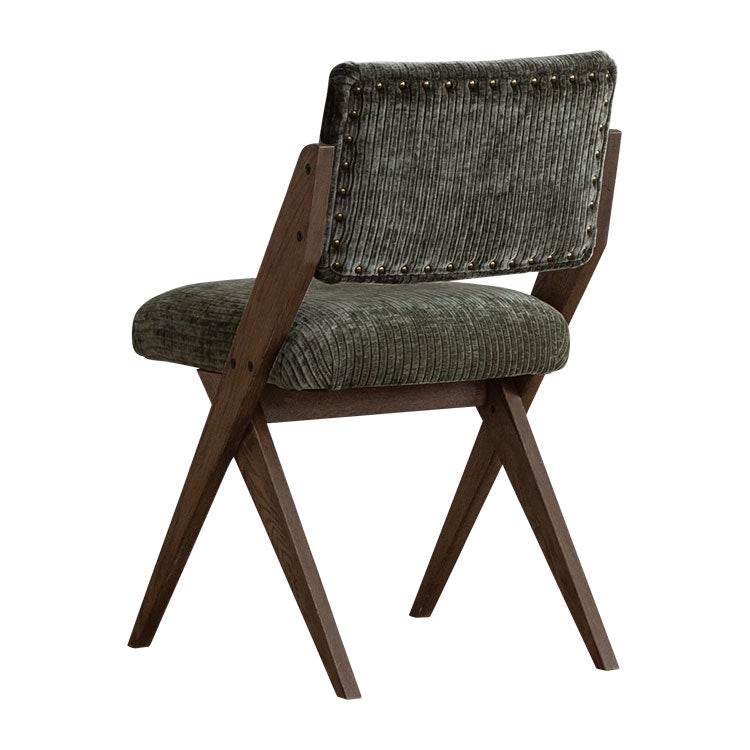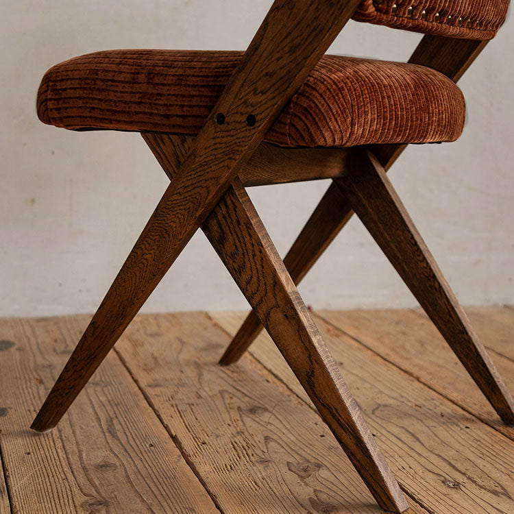 | 商品情報 | 木のシャープなクロス脚が特徴的なチェア。背面に施された鋲もアクセントになっています。部屋のテイストに合わせてお選びいただけます。 |