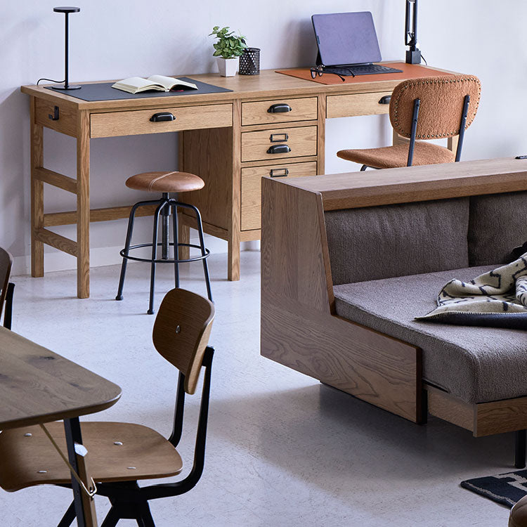 木材の表面に施した、無垢の風合いを活かした仕上げです。表面に硬い塗膜をつくるウレタン塗装とは違い、より無垢の状態に近い木の質感や手触り・風合いを残すことができ、経年変化も楽しめる仕上げです。その反面、使用中にシミや小さな傷や汚れなどがついてしまうことがあります。水拭きやアルコール成分による除菌等は可能な限り行わないでください。変形、塗装の剥離の原因となります。製品ご使用の際は可能な限りコースターやトレーなどをお使いいただき、水滴や食べカスなどが直接付着しないようにしてください。