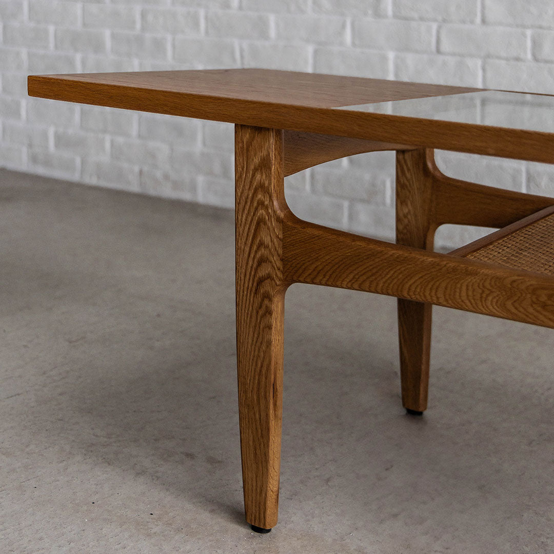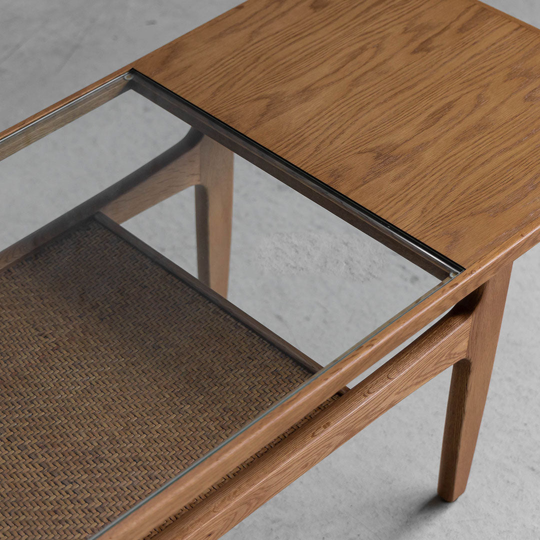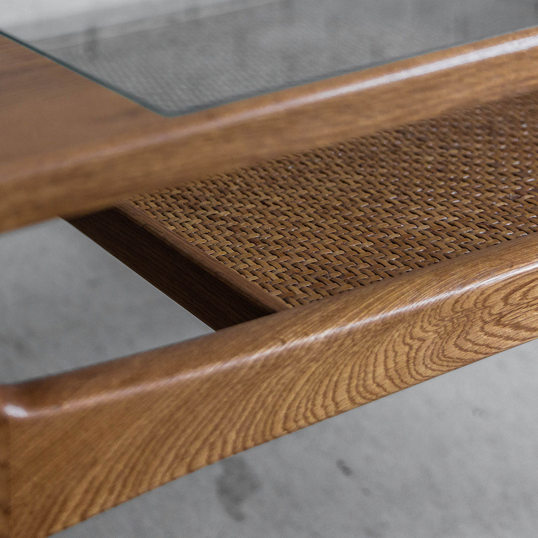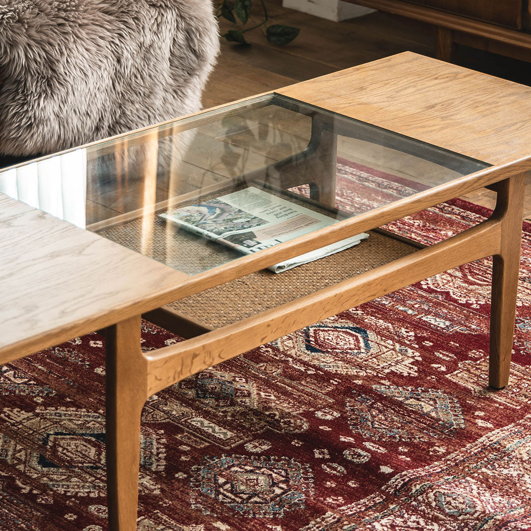 | 商品情報 | オーク材、 ガラス、 編み込みの籐を使用したエキゾチックなコーヒーテーブルです。 細部のデザインまでこだわり、すっきりと抜け感のある印象に仕上げました。 |