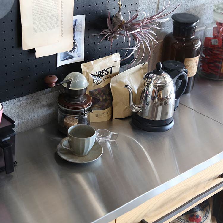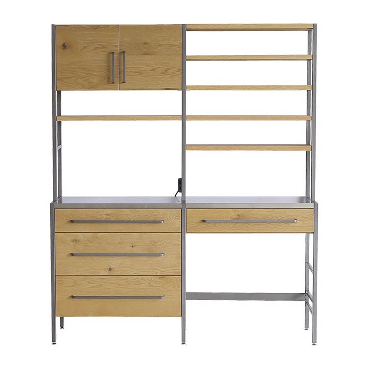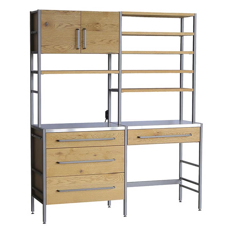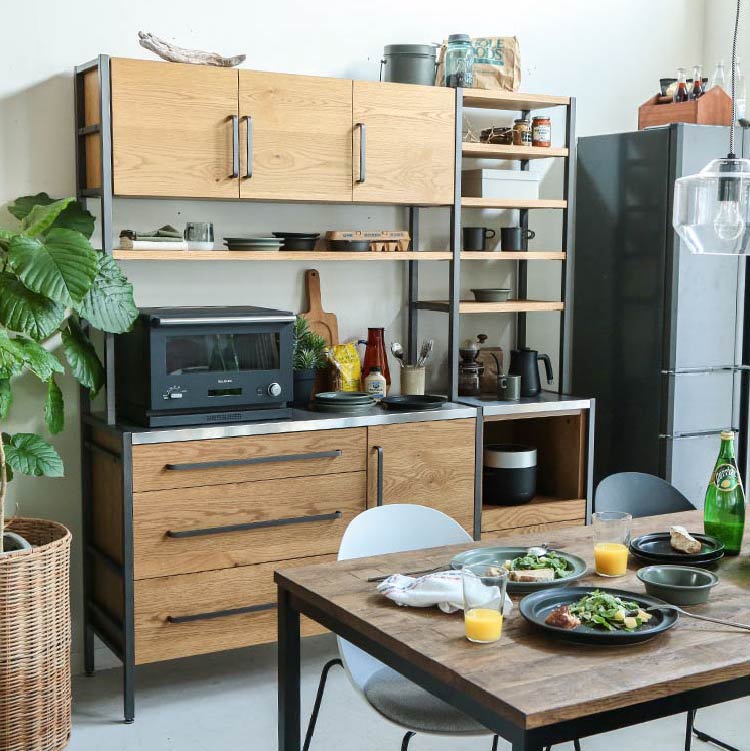 | 商品情報 | 備え付けや特注製品などでしか表現できなかったものをつくることができないか、地場の箱物家具メーカーと共同でユニット家具を作成しました。木×スチールの仕様はナチュラルからヴィンテージまで、あらゆるシーンに溶け込みます。最小幅は500mm、組み合わせ方で自由に拡張可能です。ダイニングボード、カウンターはもちろん、使い方によっては書斎やリビング、ディスプレイラックとして商空間にも最適です。 |