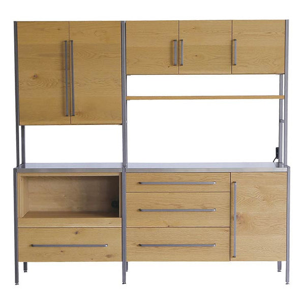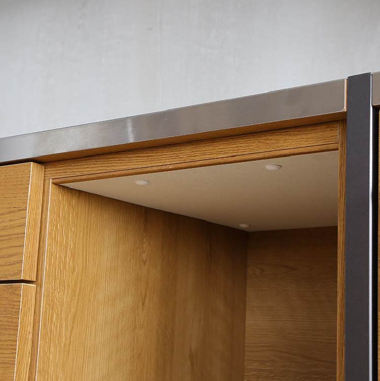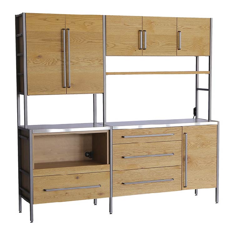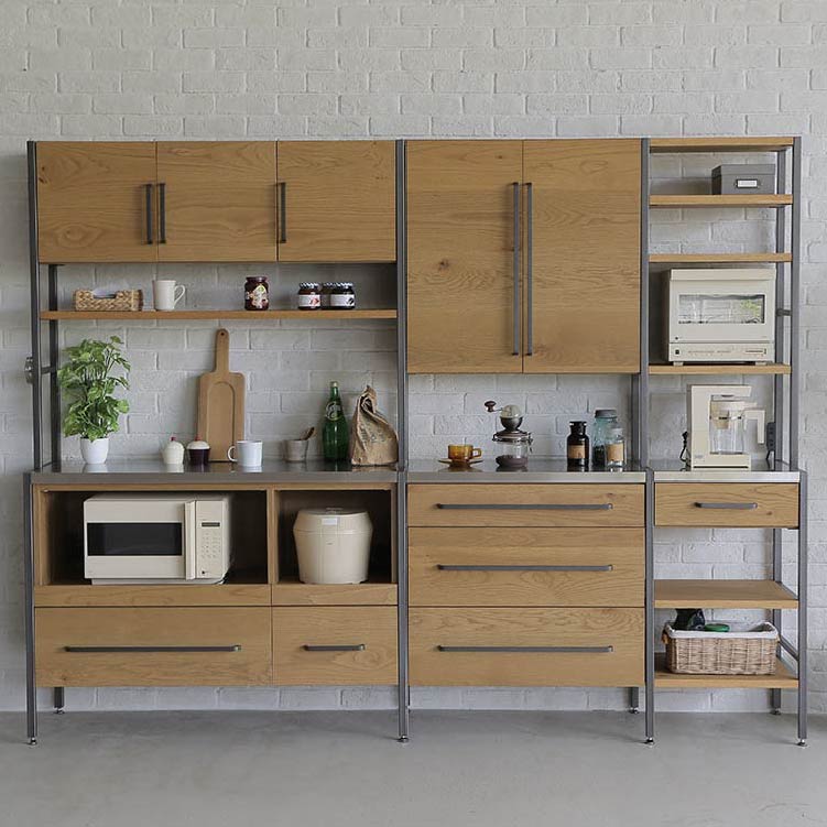| 商品情報 | 備え付けや特注製品などでしか表現できなかったものをつくることができないか、地場の箱物家具メーカーと共同でユニット家具を作成しました。木×スチールの仕様はナチュラルからヴィンテージまで、あらゆるシーンに溶け込みます。最小幅は500mm、組み合わせ方で自由に拡張可能です。ダイニングボード、カウンターはもちろん、使い方によっては書斎やリビング、ディスプレイラックとして商空間にも最適です。 |
