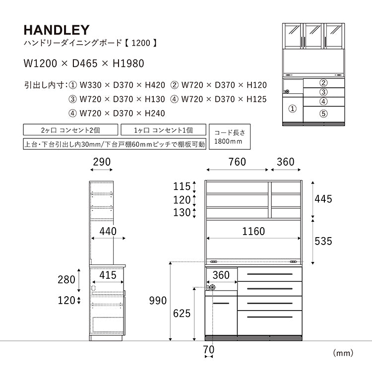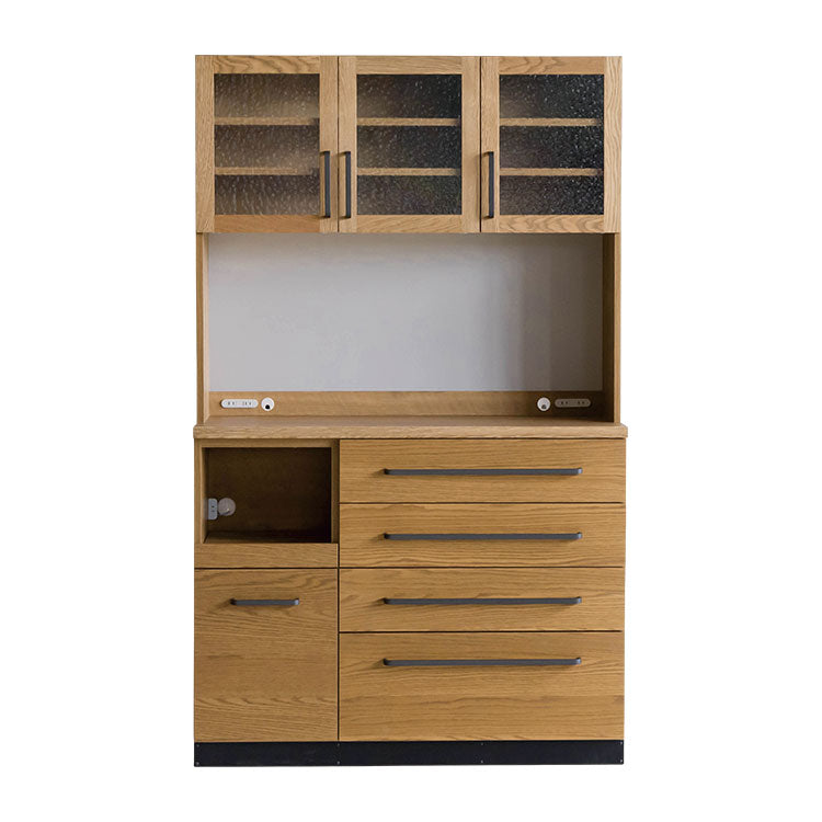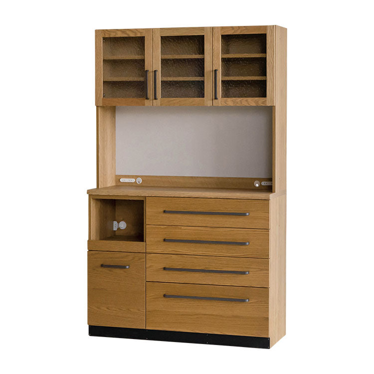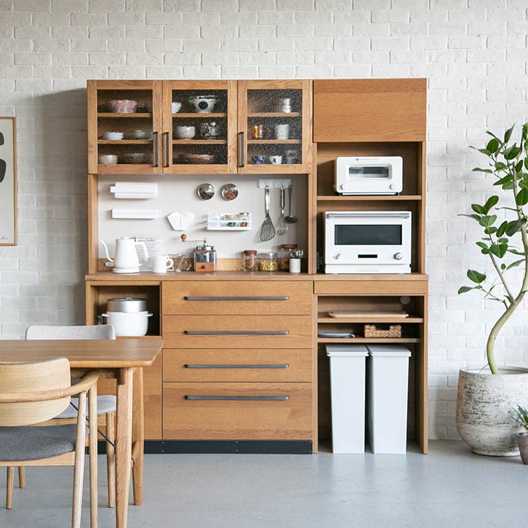 | 商品情報 | 家電が置ける作業スペースやマグネット対応バックボード、フルスライドレールの引出しなど、キッチンに求められる機能を盛り込んだダイニングボードです。必要な用途やスペースに応じて、アイテムを追加・連結できるユニットシステムを採用しています。木の自然な風合いが感じられるオーク材のナチュラルな雰囲気に、ヴィンテージ仕上げのスチールパーツやデザインガラスをあしらい、こだわりのデザインに仕上げています。 |