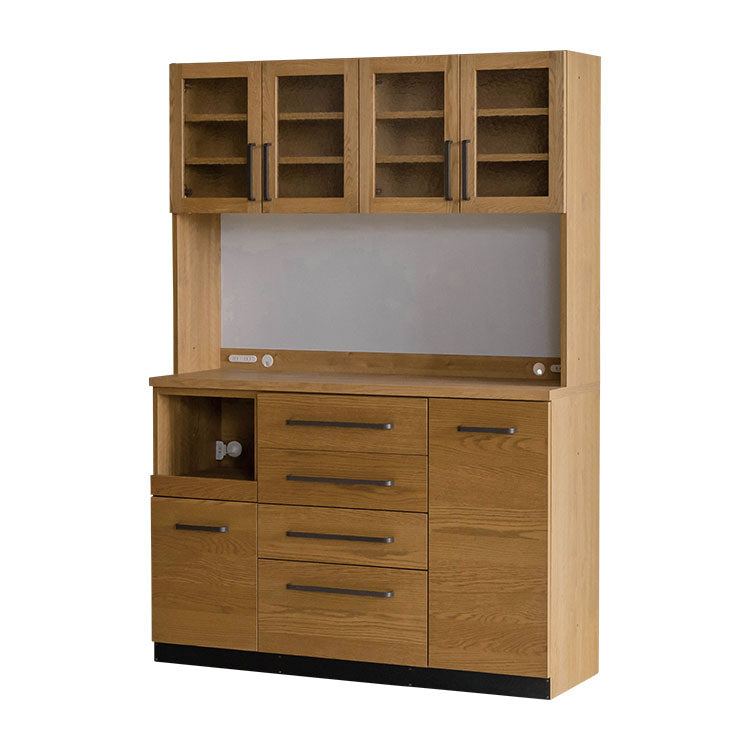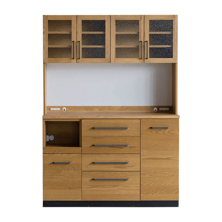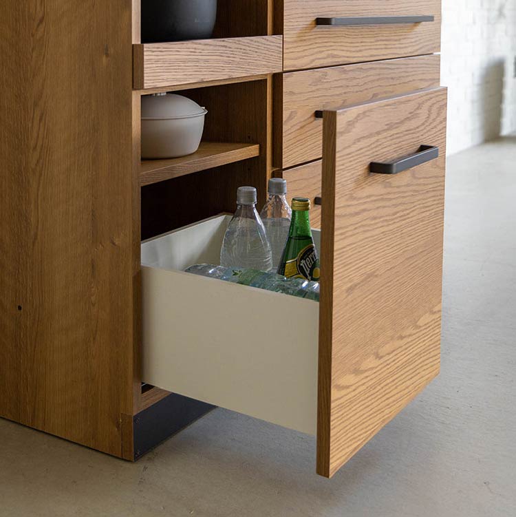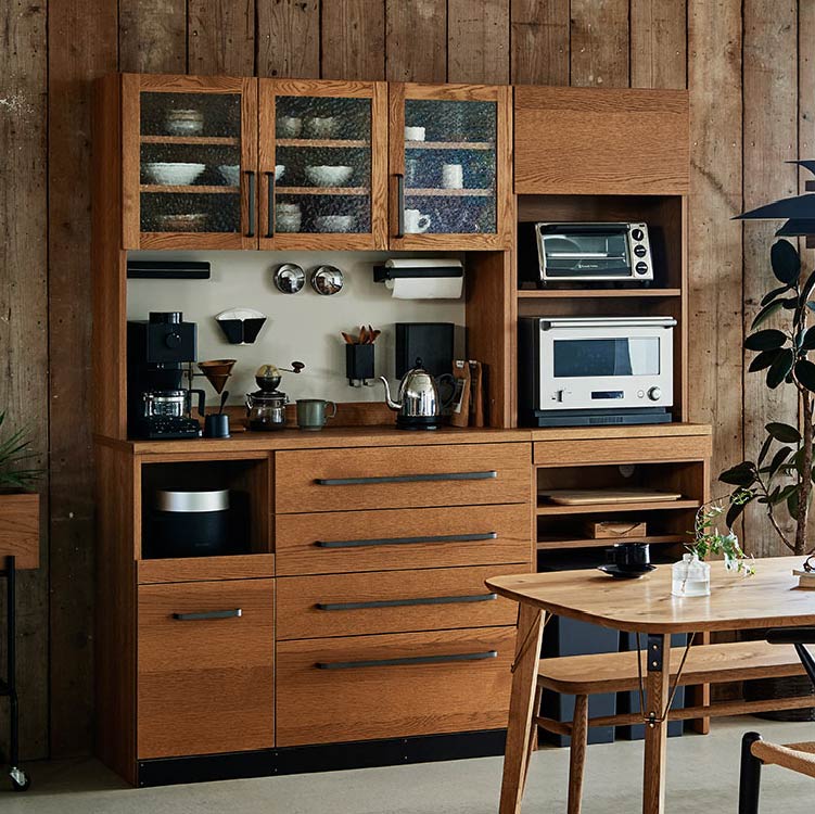 | 商品情報 | 家電が置ける作業スペースやマグネット対応バックボード、フルスライドレールの引出しなど、キッチンに求められる機能を盛り込んだダイニングボードです。必要な用途やスペースに応じて、アイテムを追加・連結できるユニットシステムを採用しています。木の自然な風合いが感じられるオーク材のナチュラルな雰囲気に、ヴィンテージ仕上げのスチールパーツやデザインガラスをあしらい、こだわりのデザインに仕上げています。 |