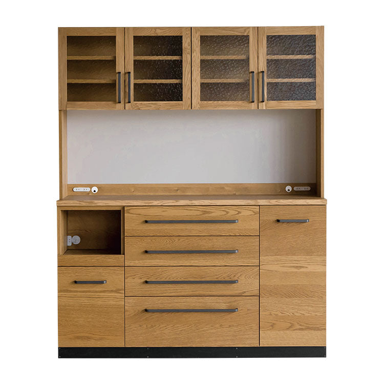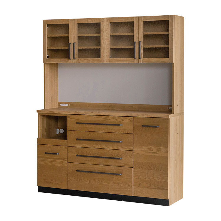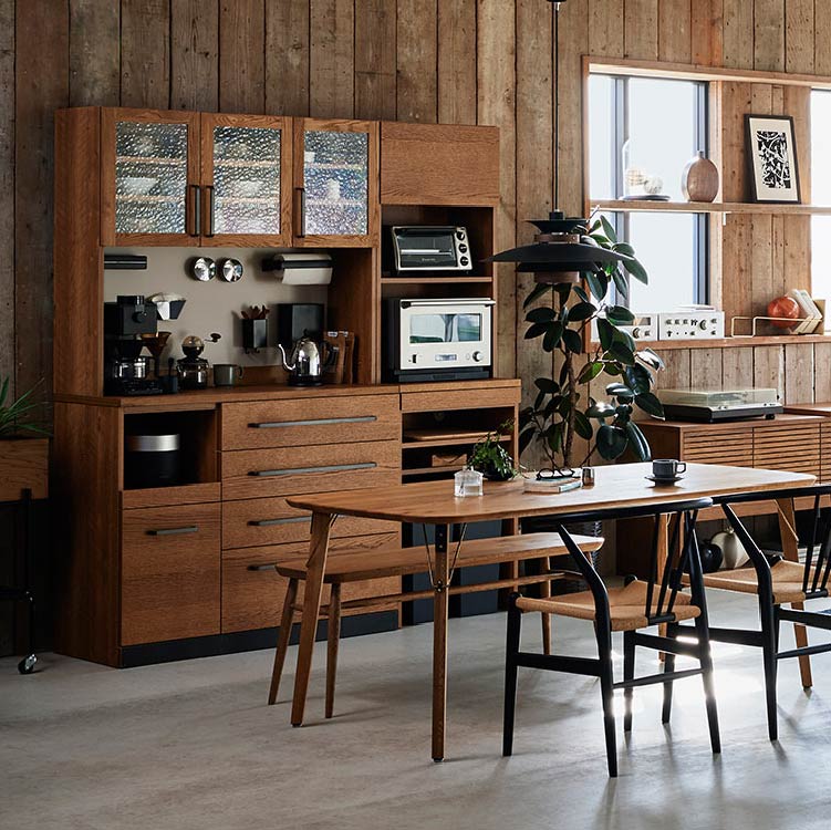 | 商品情報 | 家電が置ける作業スペースやマグネット対応バックボード、フルスライドレールの引出しなど、キッチンに求められる機能を盛り込んだダイニングボードです。必要な用途やスペースに応じて、アイテムを追加・連結できるユニットシステムを採用しています。木の自然な風合いが感じられるオーク材のナチュラルな雰囲気に、ヴィンテージ仕上げのスチールパーツやデザインガラスをあしらい、こだわりのデザインに仕上げています。 |