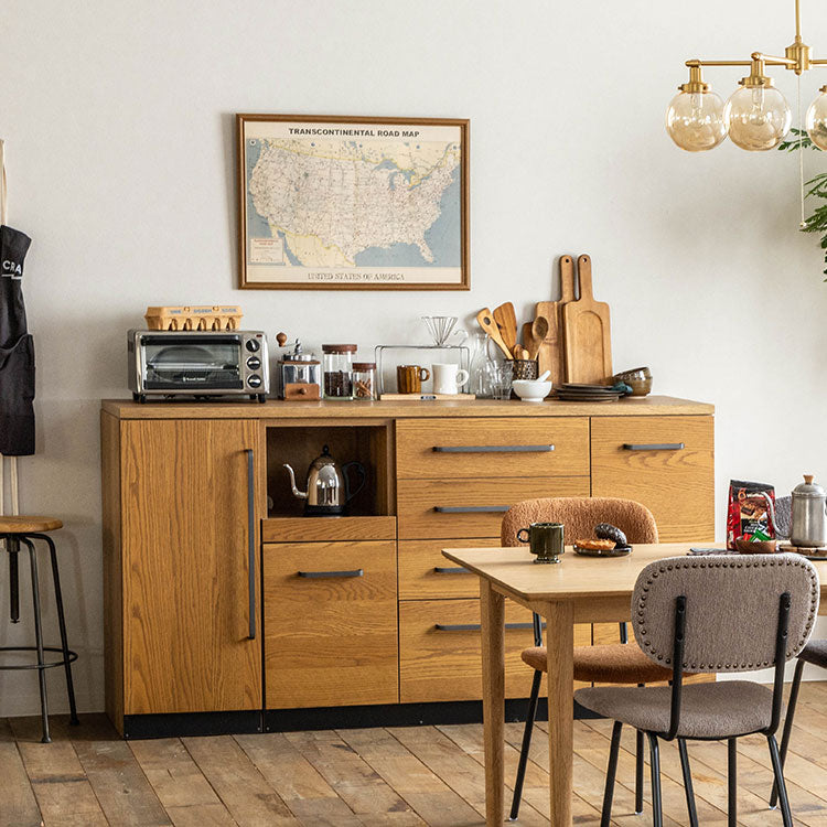 | 商品情報 | 家電が置ける作業スペースやマグネット対応バックボード、フルスライドレールの引出しなど、キッチンに求められる機能を盛り込んだダイニングボードです。必要な用途やスペースに応じて、アイテムを追加・連結できるユニットシステムを採用しています。木の自然な風合いが感じられるオーク材のナチュラルな雰囲気に、ヴィンテージ仕上げのスチールパーツやデザインガラスをあしらい、こだわりのデザインに仕上げています。 |