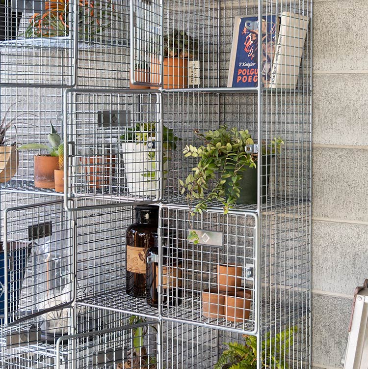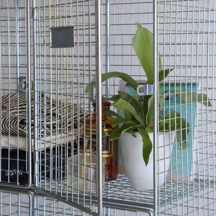 | 商品情報 | イギリスの学校や仕事現場などで使われているワイヤーメッシュのロッカーキャ ビネット。全方位スケルトン仕様で存在感のあるデザインです。靴、アウトドア 用品の収納、観葉植物のディスプレイなどアイディア次第で様々な用途で使 用可能。店舗什器としてもおすすめです。 |
