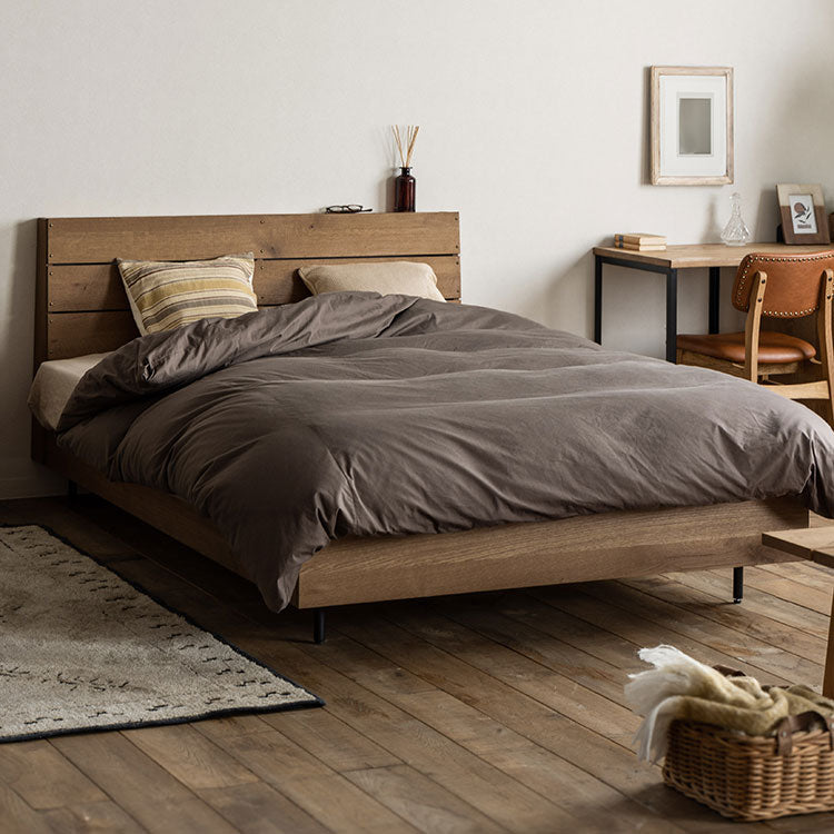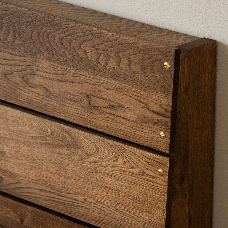 商品情報 | オーク材をオイルで仕上げることで木の豊かな表情や質感を活かし、温かみも感じさせます。アクセントに真鍮の鋲があしらわれ、カジュアルさを持ちつつも洗練された印象を与えます。ヘッド上部はちょっとした小物が置けるスペースになっています。 |