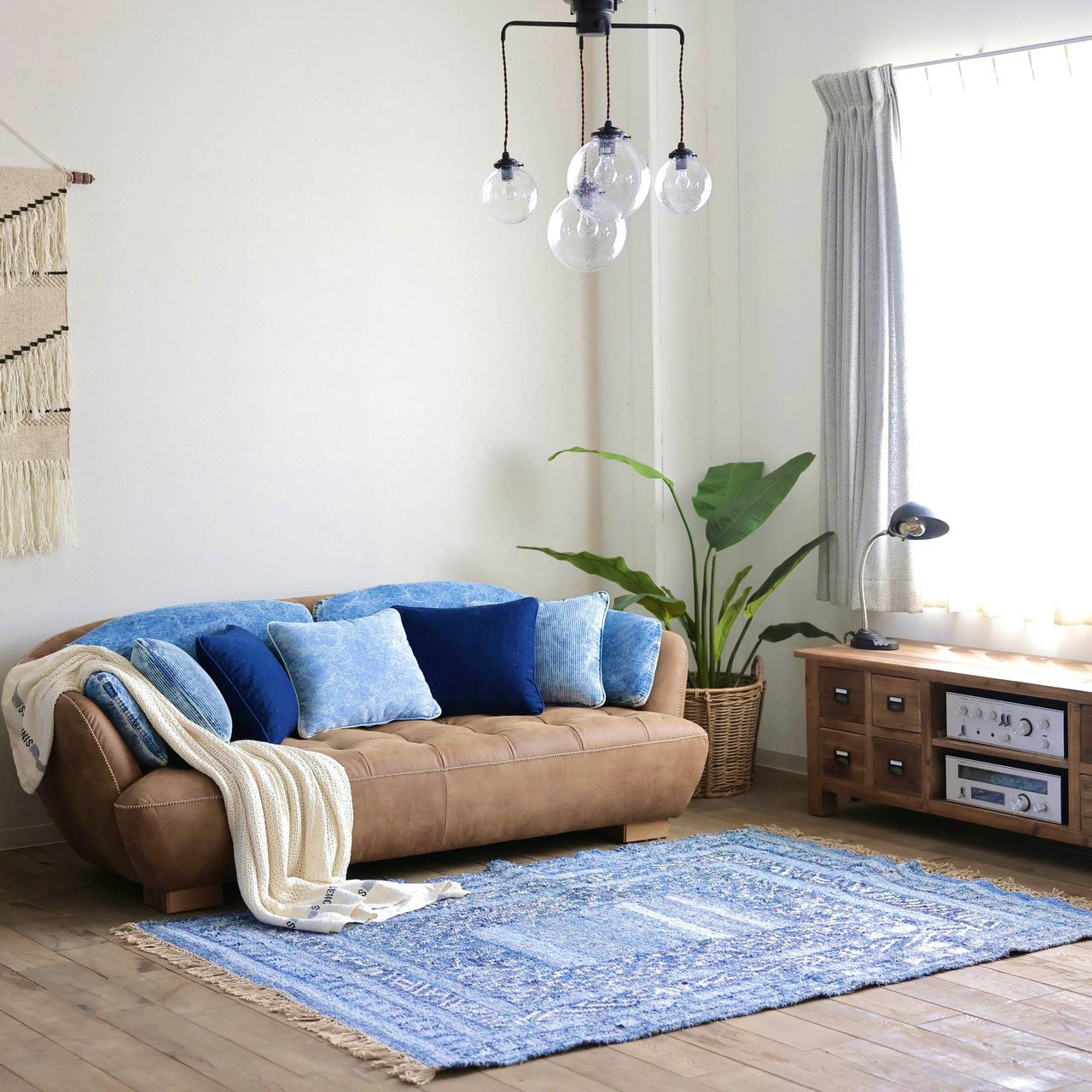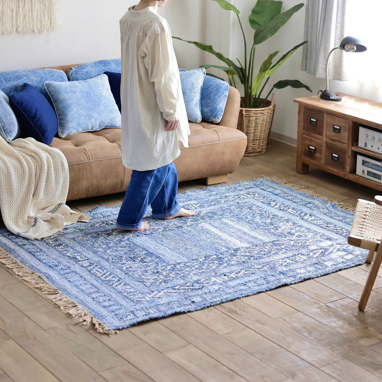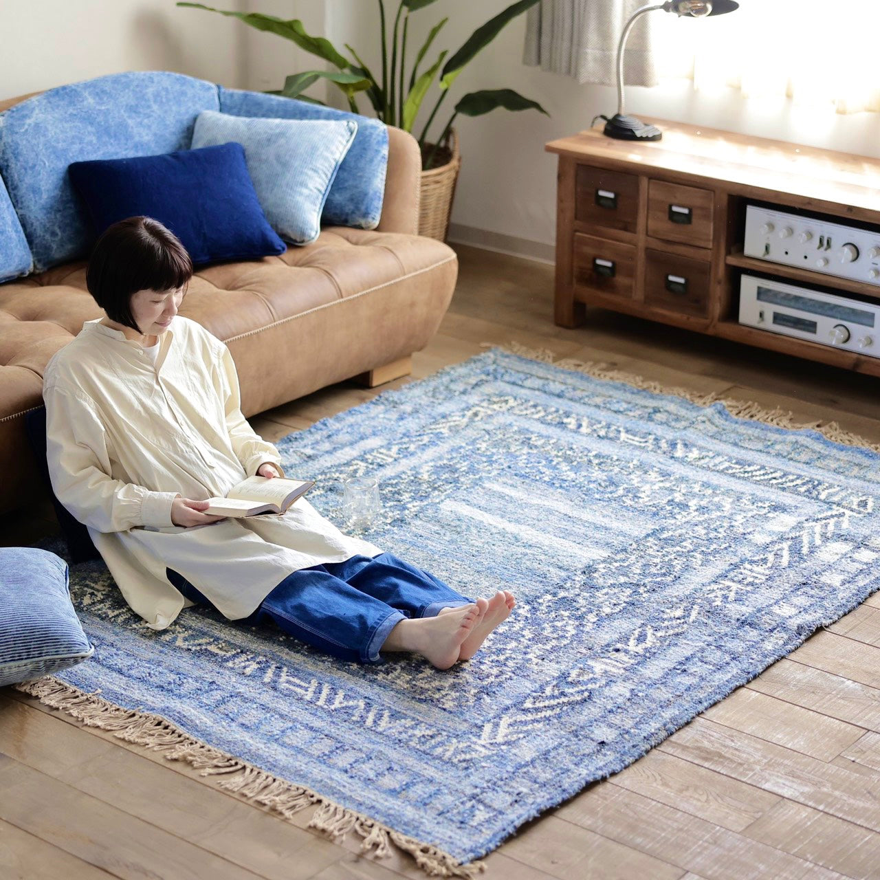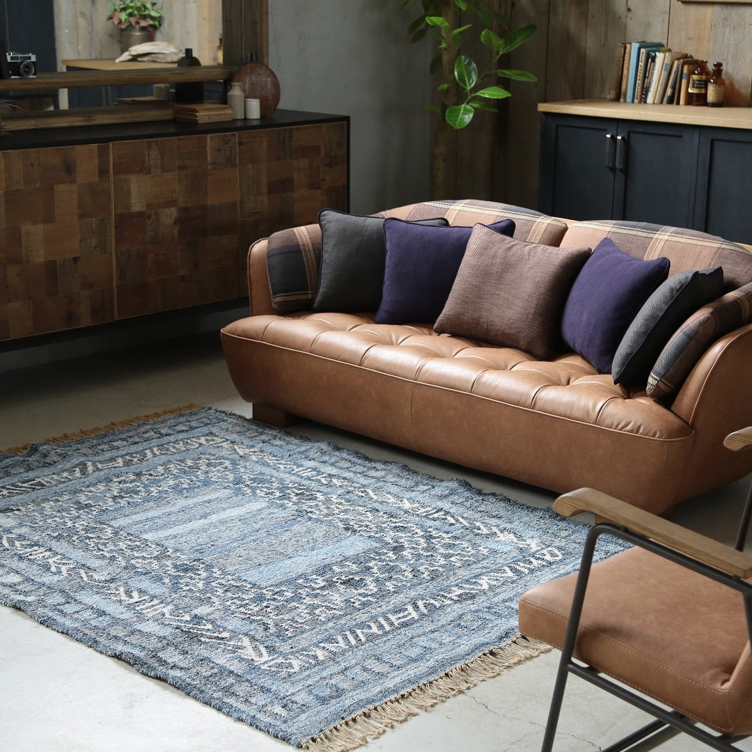 商品情報 | デニムのハギレを糸のようにして手織りで一枚一枚織り上げました。ユーズドデニムならではの濃淡のカラーリングをメインにさりげなくウール糸で模様を施しました。伝統的なキリム柄と相反するデニムというラフな素材の組み合わせがユニークで独特の魅力をもつラグです。 |