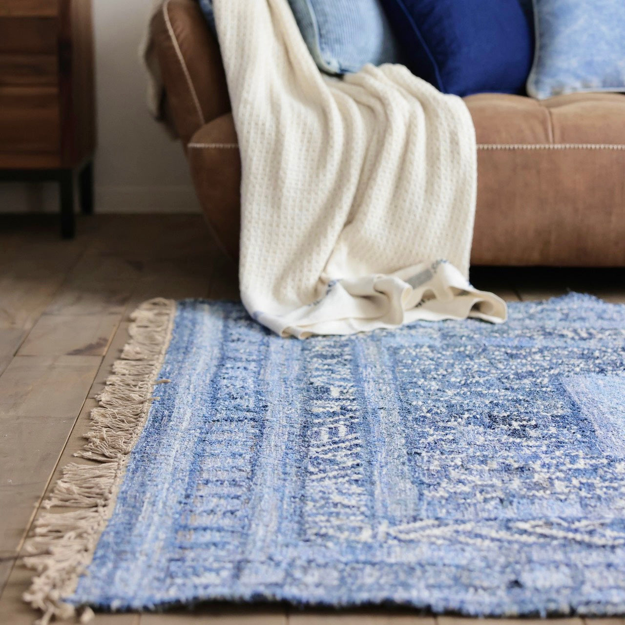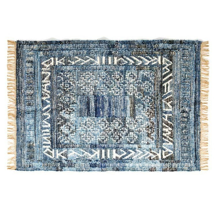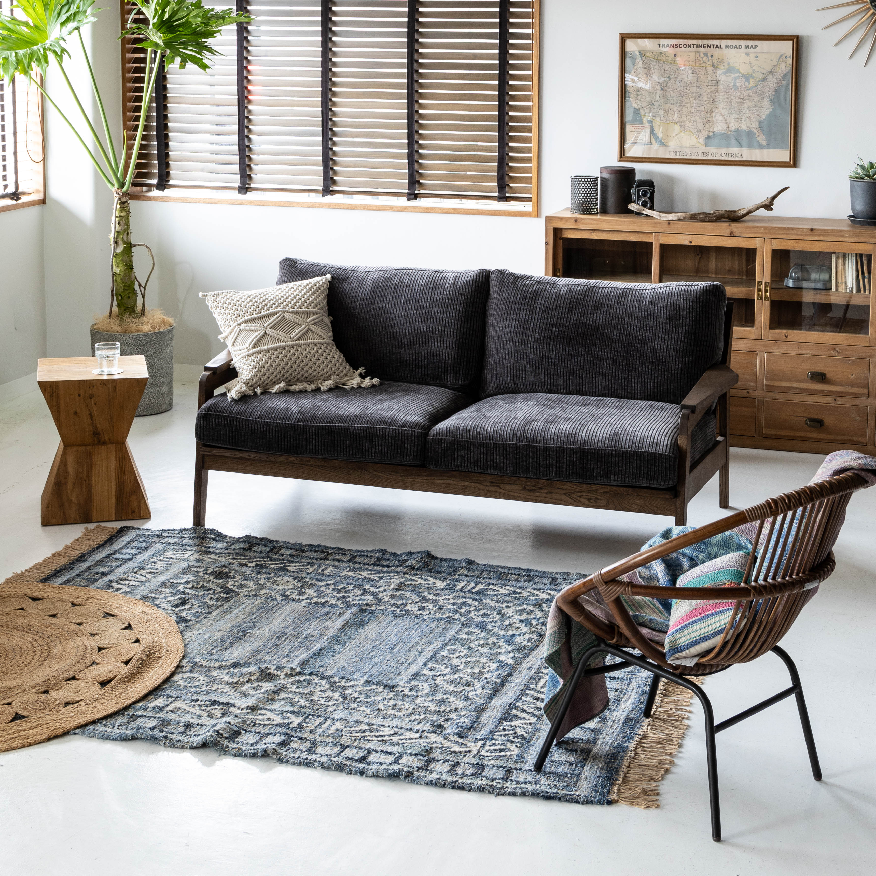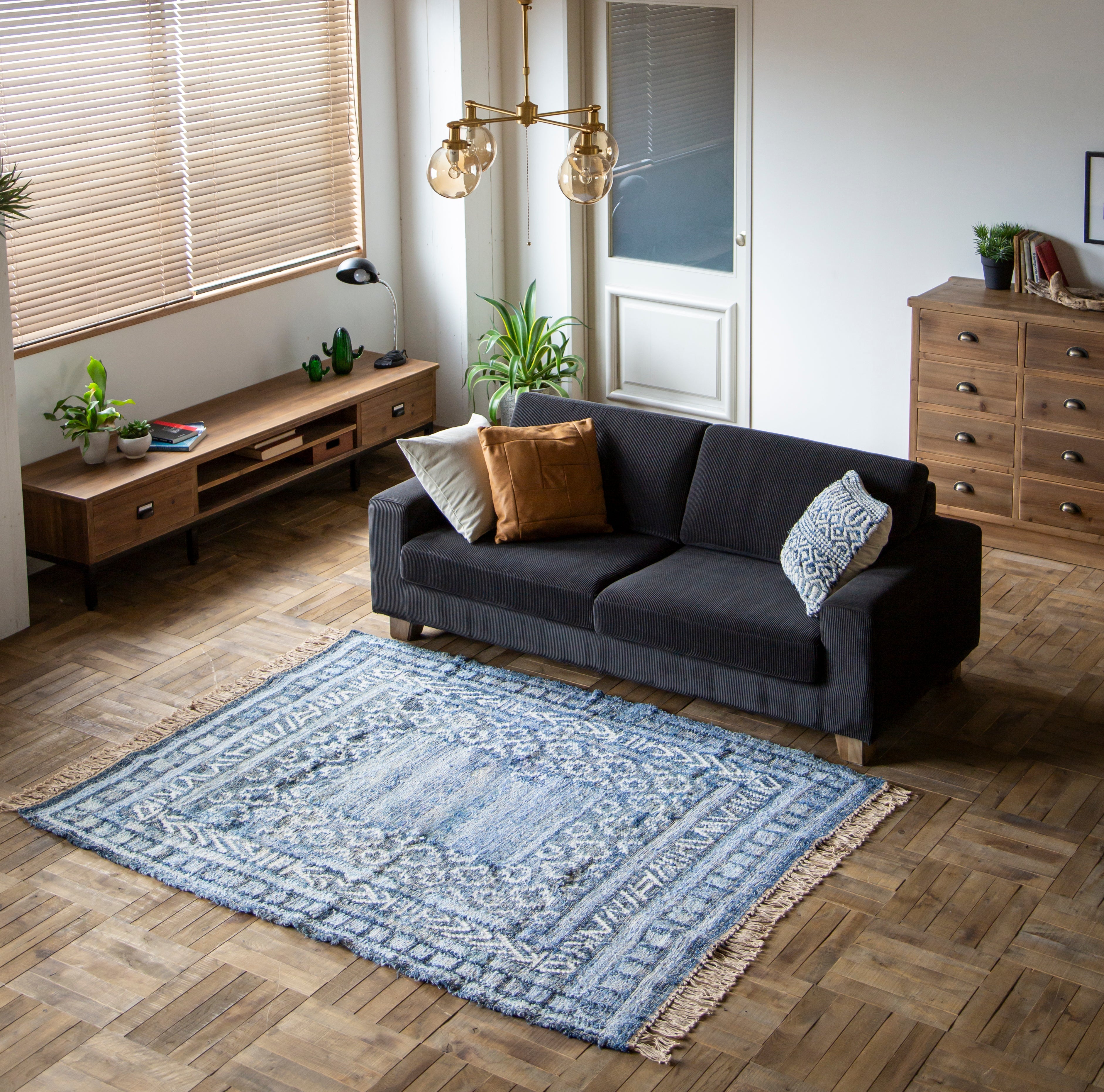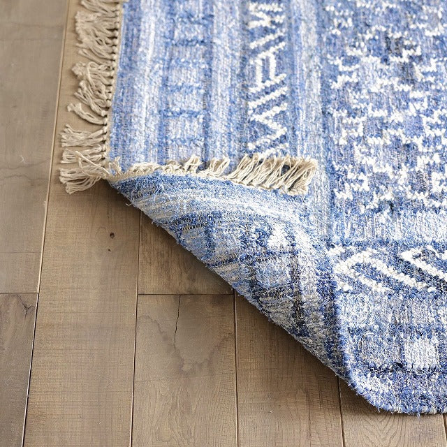 商品情報 | デニムのハギレを糸のようにして手織りで一枚一枚織り上げました。ユーズドデニムならではの濃淡のカラーリングをメインにさりげなくウール糸で模様を施しました。伝統的なキリム柄と相反するデニムというラフな素材の組み合わせがユニークで独特の魅力をもつラグです。 |