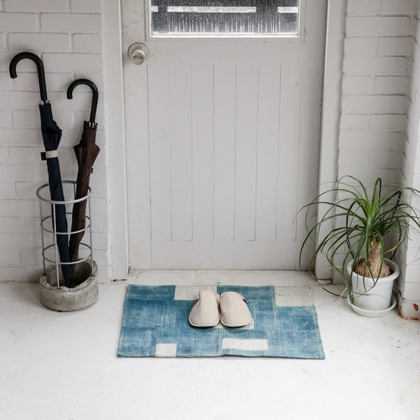 商品情報 コットンで織り上げた生地を、ブルーに後染めし 異なるトーンでランダムにつないだデニムパッチワークマット。ブルーの色ムラが印象的で存在感のあるデニムライクな仕上がりです。
