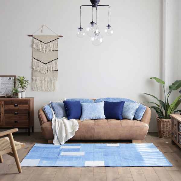 | 商品情報 | コットンで織り上げた生地を、ブルーに後染めし 、異なるトーンでランダムにつなぎ合わせています。 ブルーの色ムラが印象的で存在感のあるデニムライクなパッチワークラグに仕上がっています。レザーやウッドの家具によく合い、ヴィンテージ、インダストリアル、カジュアルなインテリアのコーディネートにオススメです。 |
