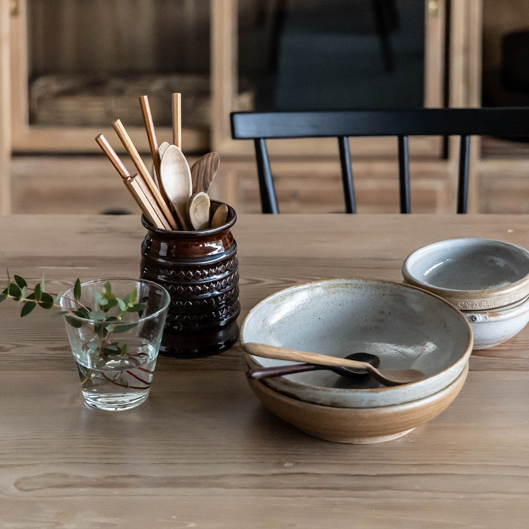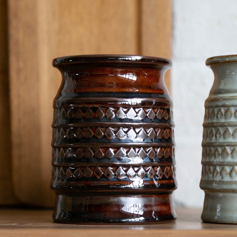 | 商品情報 | レリーフ模様がきれいな北欧をイメージしたスカンジナビアツールスタンド。貫入や釉薬により、豊かな表情で味わいがあります。木のツールやカトラリーとの相性も抜群です。 |