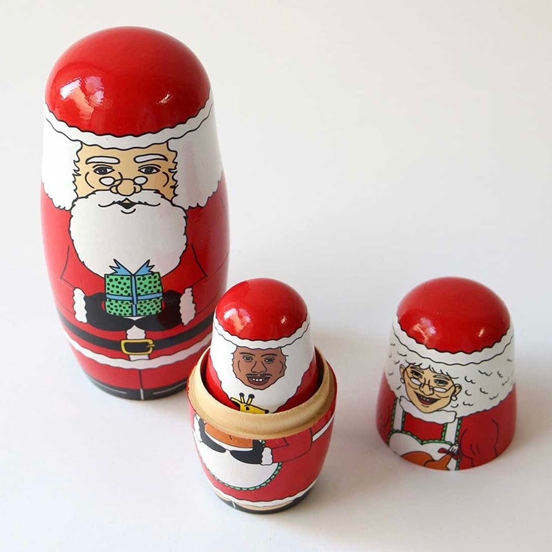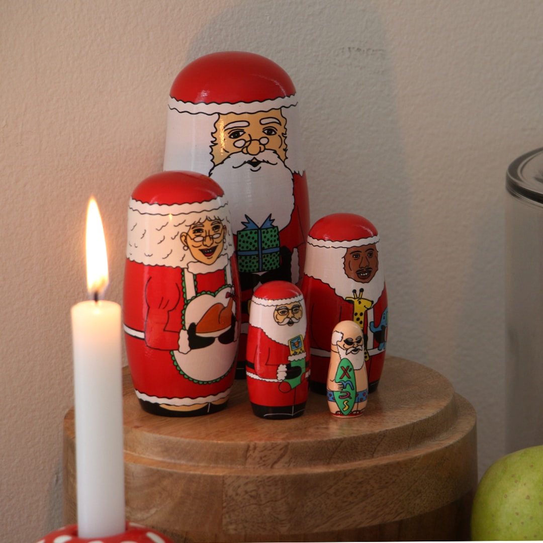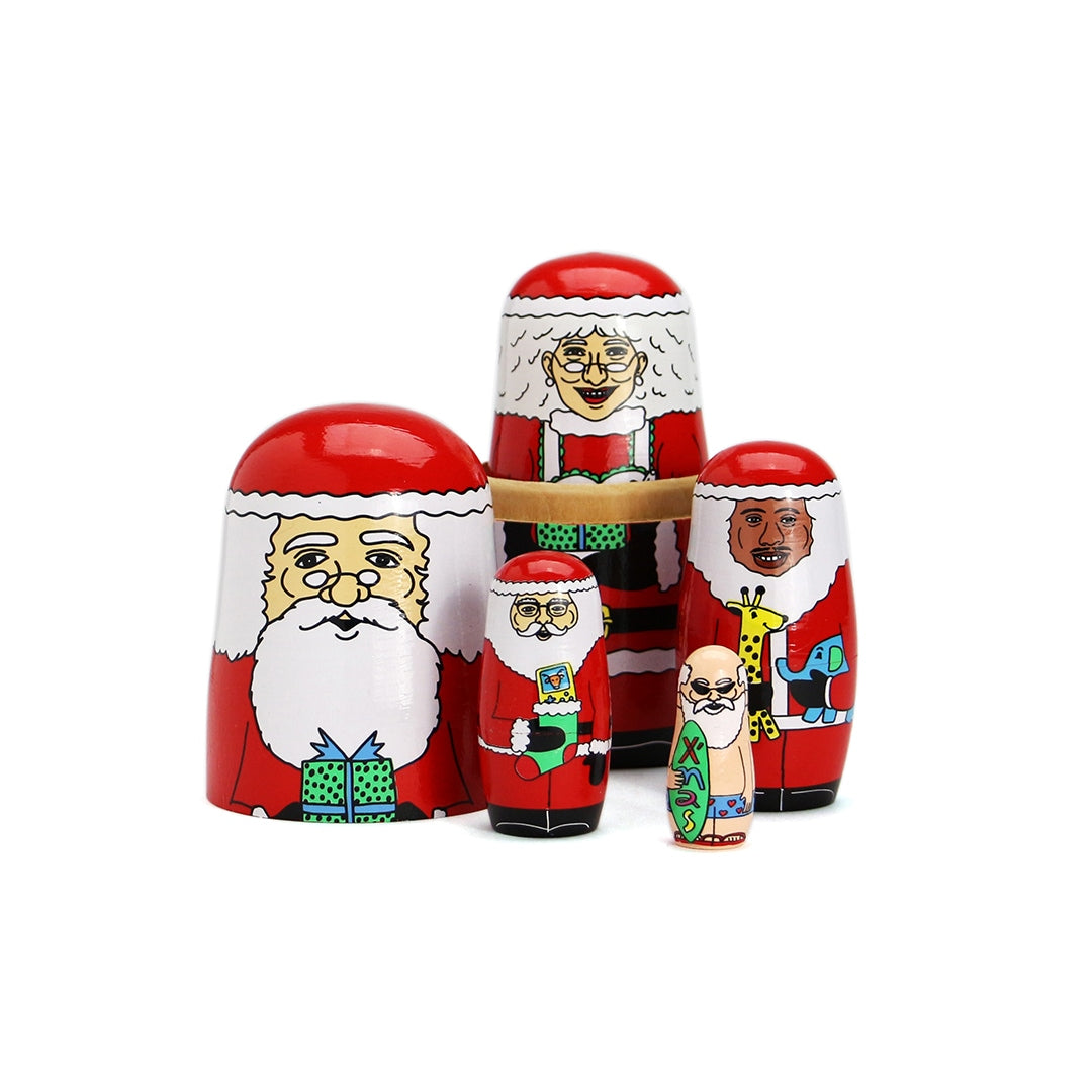 商品情報 | オリンピックの五輪マークでもお馴染みのヨーロッパ大陸、アメリカ大陸、アフリカ大陸、アジア大陸、オーストラリア大陸の5大陸をイメージしたサンタがマトリョーシカになりました。 |