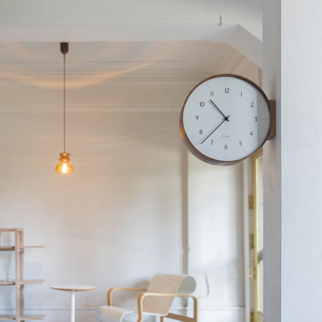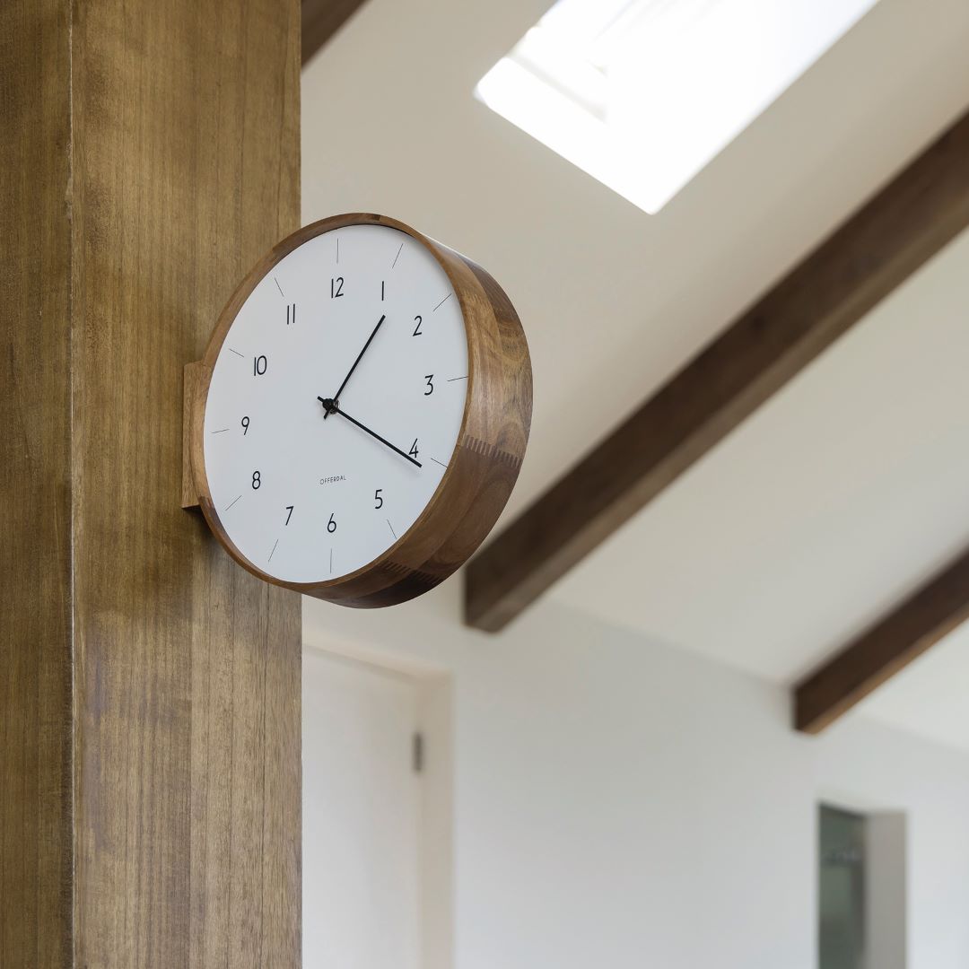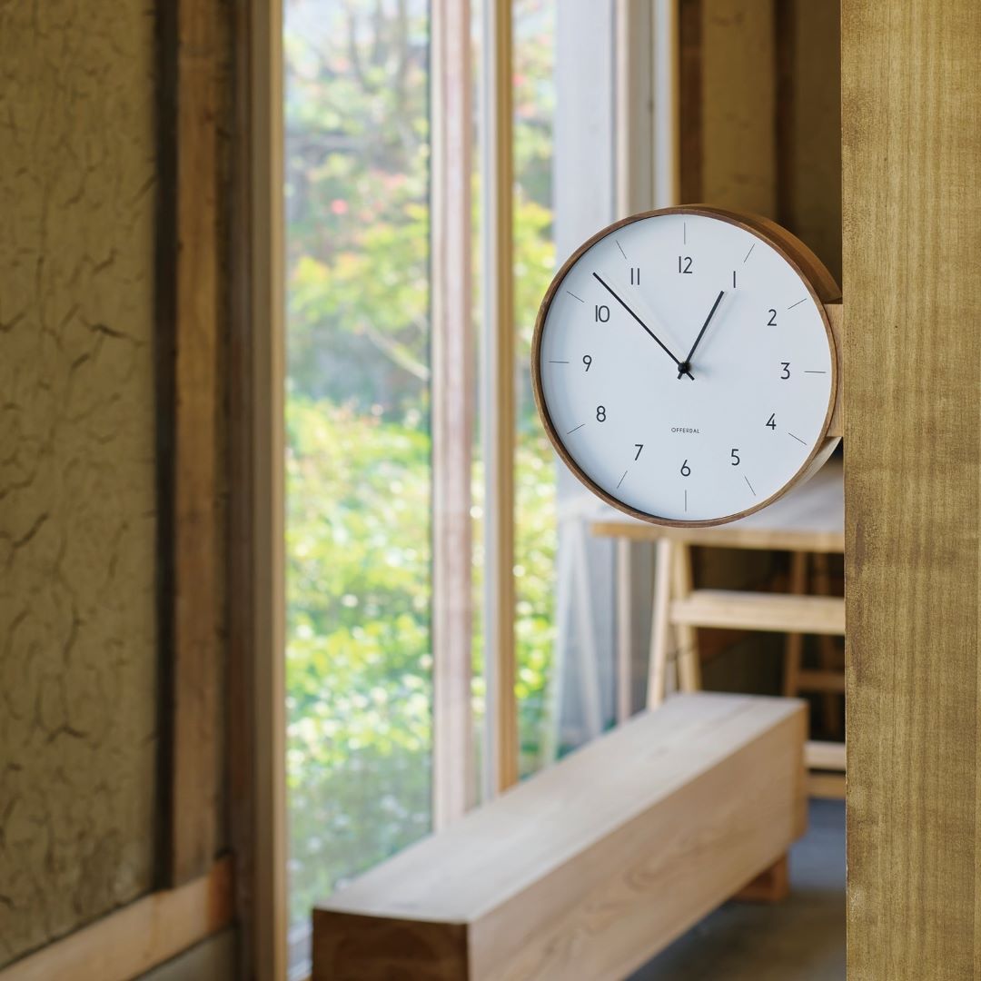 | 商品情報 | 天然木を使用したウッドフレームの両面時計。より幅広いインテリアに馴染みやすく、使い勝手の良いデザインに仕上がっています。 |