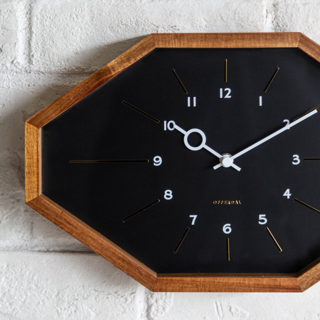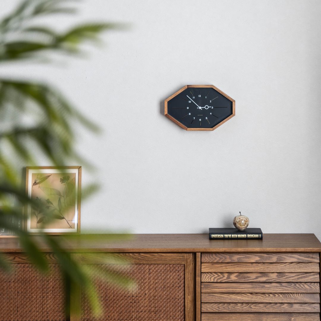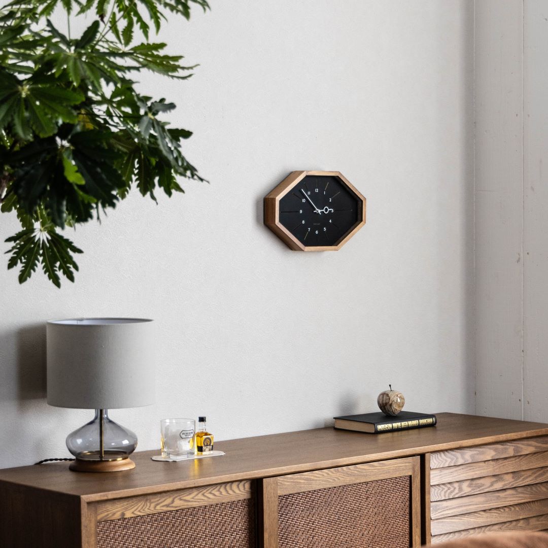 | 商品情報 | 横に長い8角形のフォルムがレトロな趣を感じさせるウォールクロック。 シンプルにまとめた文字盤にゴールドパーツを忍ばせた、遊び心と高級感が共存したデザインです。 |