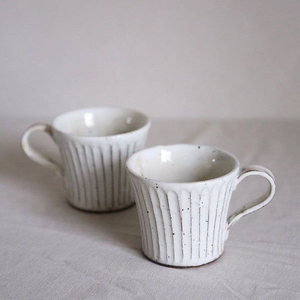 商品情報 細かく入った削ぎ模様と粉引の釉薬が味わいのあるマグカップ。釉薬のたれ具合や鉄粉が入った粉引きの風合いがとても魅力的です。飲みやすさや持った時の安定感が考えられたデザイン。 ペアで化粧箱入りなのでギフトにも喜ばれます。