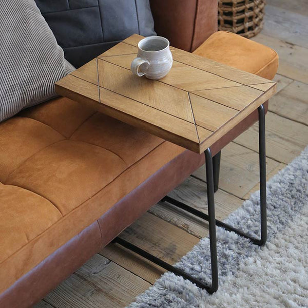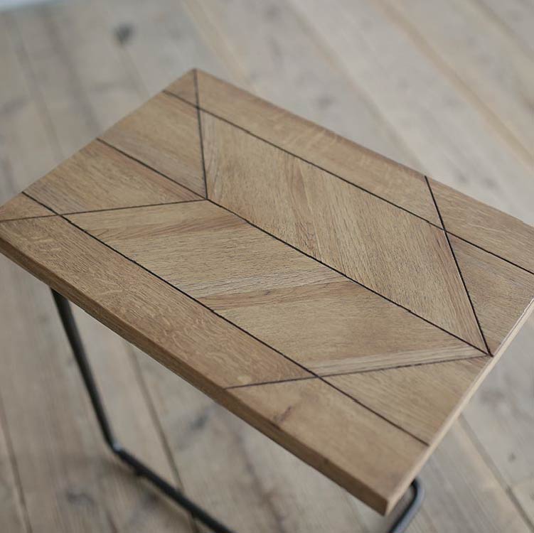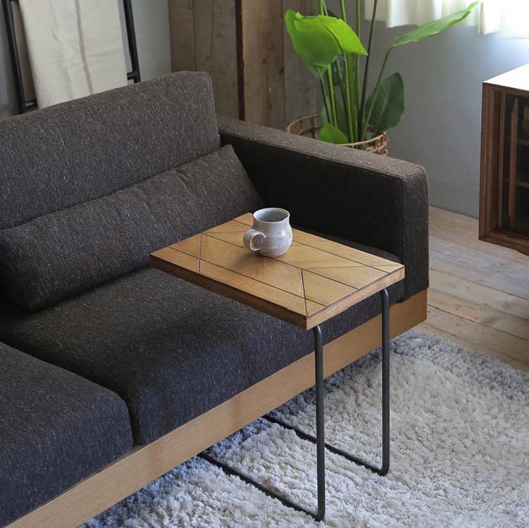 | 商品情報 | ユニークなコの字型のサイドテーブルです。ソファに挟んでご使用いただくことができます。矢柄に寄木した温かみのあるオーク材もさりげなく目を惹くポイントです。 |