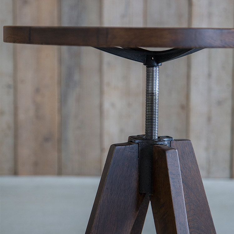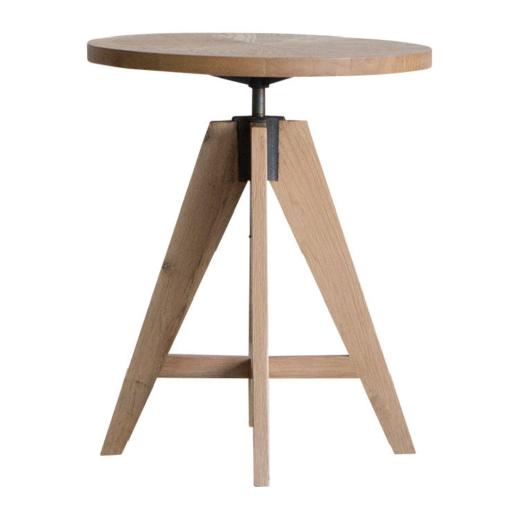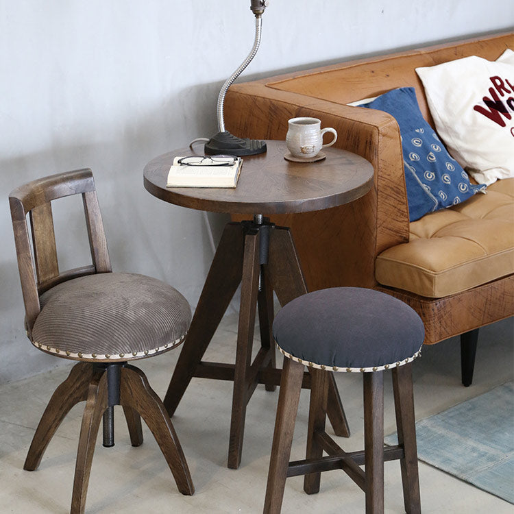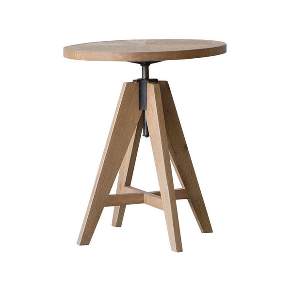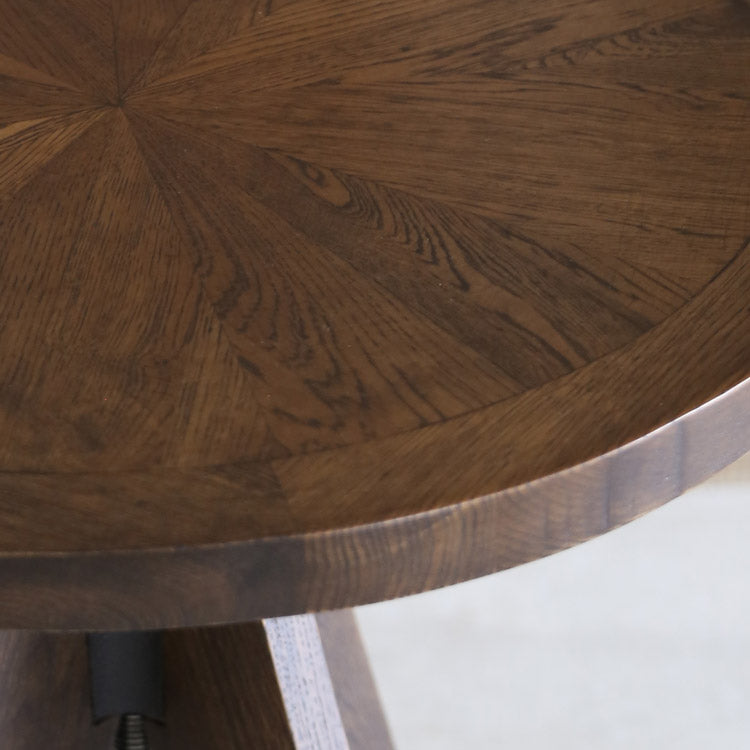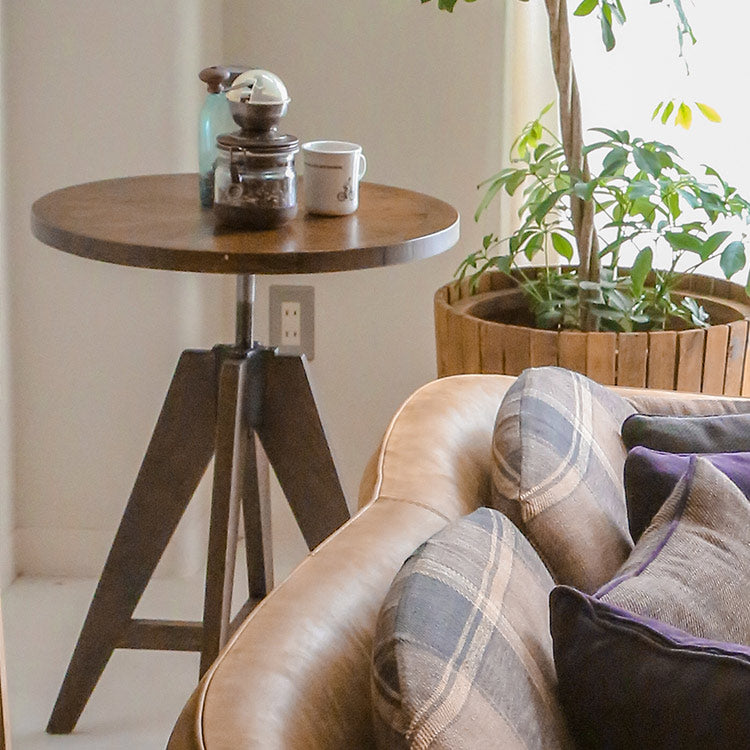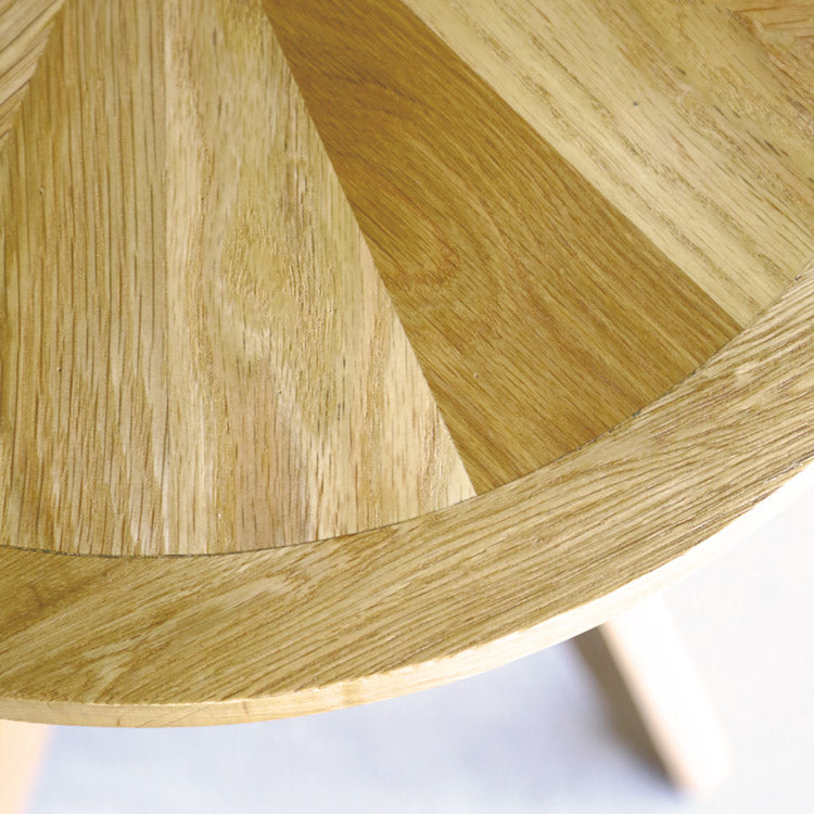 商品情報 寄木柄が特徴的なラウンドテーブル。天板を回して高さが変えられます。