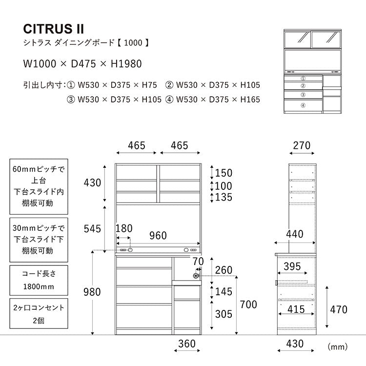| コンセント詳細 | 上台:2口コンセント白x2、下台:1口コンセントx1 |