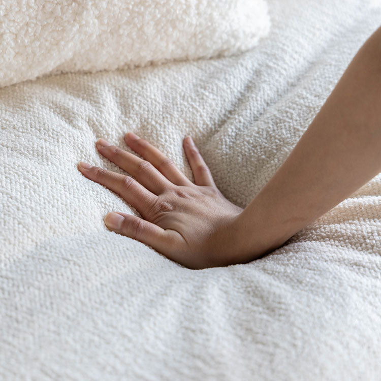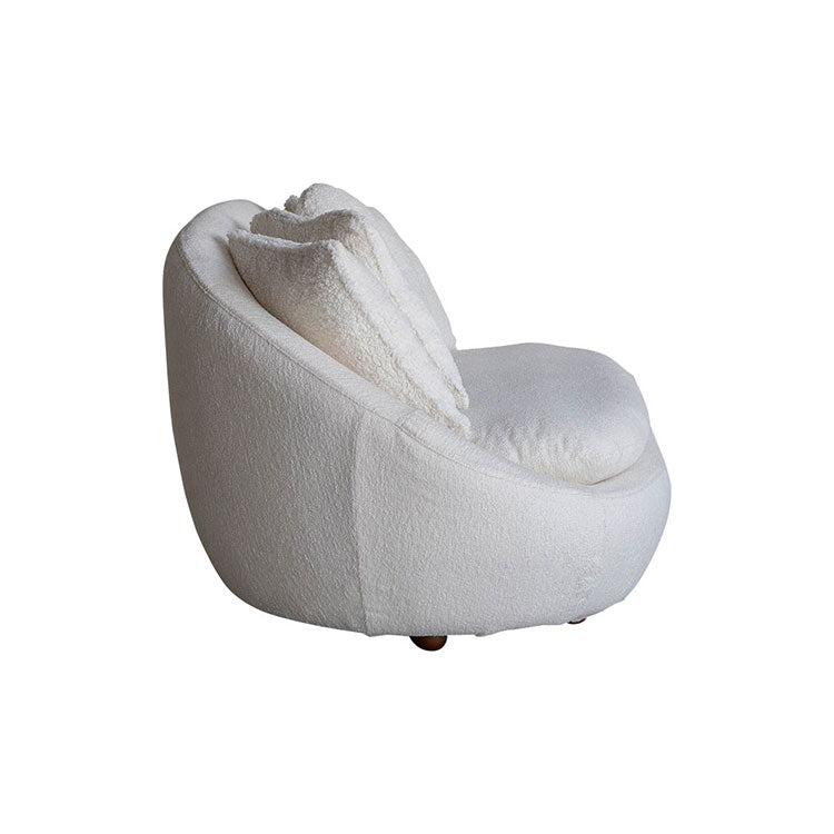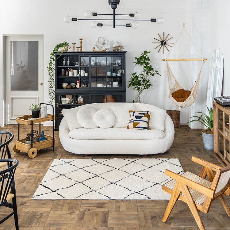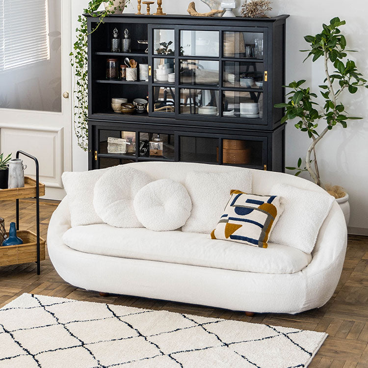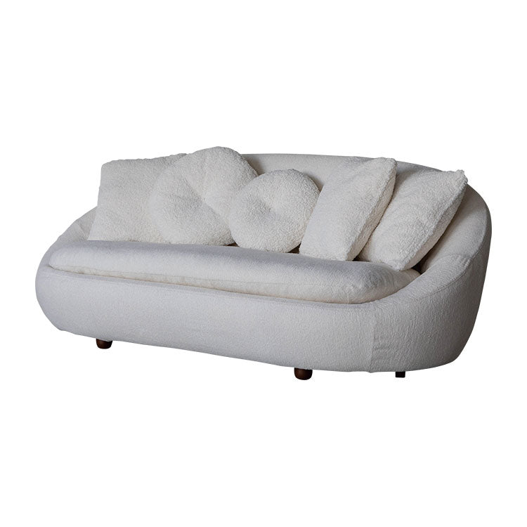 商品情報 丸みのある可愛らしいフォルムのソファ。立体感のあるブークレ生地を使用した丸と四角の2種類のクッションが特徴です。柔らかく心地よい肌触りの、ループ状の糸を使用しています。
