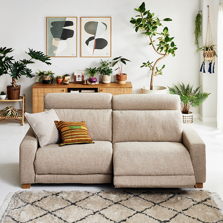 | 商品情報 | 肘横のスイッチで座姿勢の切り替えができる電動リクライナーソファ。心地よく沈み込むフェザー入りクッションに全身をあずける、極上のリラックス感が味わえます。リクライナー特有の重厚すぎる存在感を払拭するスマートデザインで、スタイリッシュなコーディネートが叶います。 |