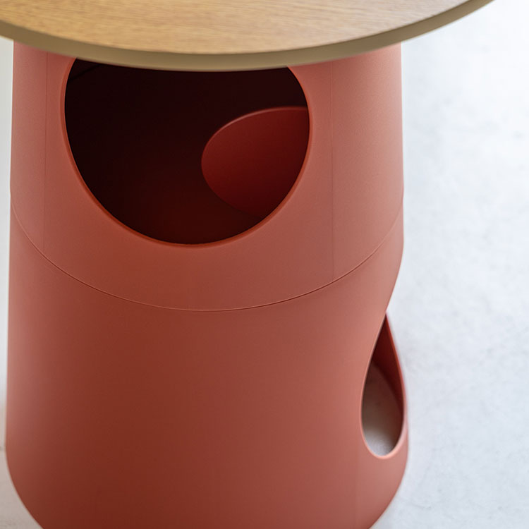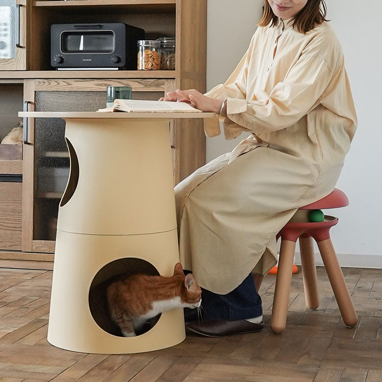 | 商品情報 | プーラサイドテーブルは、テーブルに2段式のキャットタワーが一体化したサイドテーブルです。飼い主の側で愛猫が遊ぶ、隠れる、リラックスする等、ネコの好奇心を満たしつつ、快適に過ごせるように企画しました。テーブルは食事や書き物をするなど、1人で使える程度のコンパクトなサイズ感です。リビングやダイニングなど家族が集まる場所に設置すれば、ネコも家族も一緒に過ごせます。 |