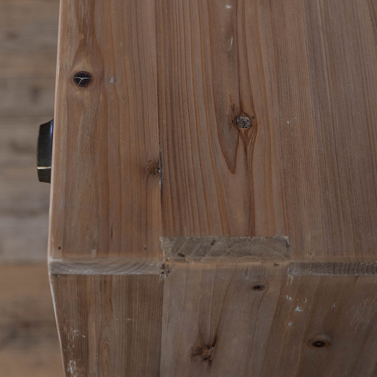 使用している古材にはその特性と風合いを生かして表現するような加工を施しております。そのため「天板の凹凸」「補修跡」「木材の表情が一点一点異なる」「色の濃淡割れや釘穴、連結穴の跡」「板の継ぎ目が浮き出て見えるようなライン」などの特徴がございます。長年ご使用いただくことを想定して強度や構造を設計・製造しておりますので、安心してご利用いただくことができます。