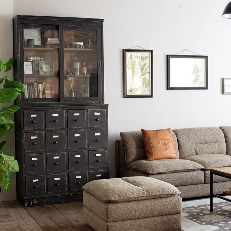 | 商品情報 | 薬棚をモチーフにしたキャビネットです。職人の手で丁寧に剥がし加工を行い、アンティークな雰囲気を演出しています。扉がガラスタイプの商品のみ裏板に杉古材を使用しています。下置き単体での使用も可能です。 |
