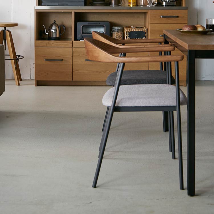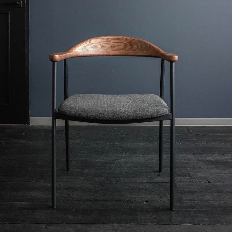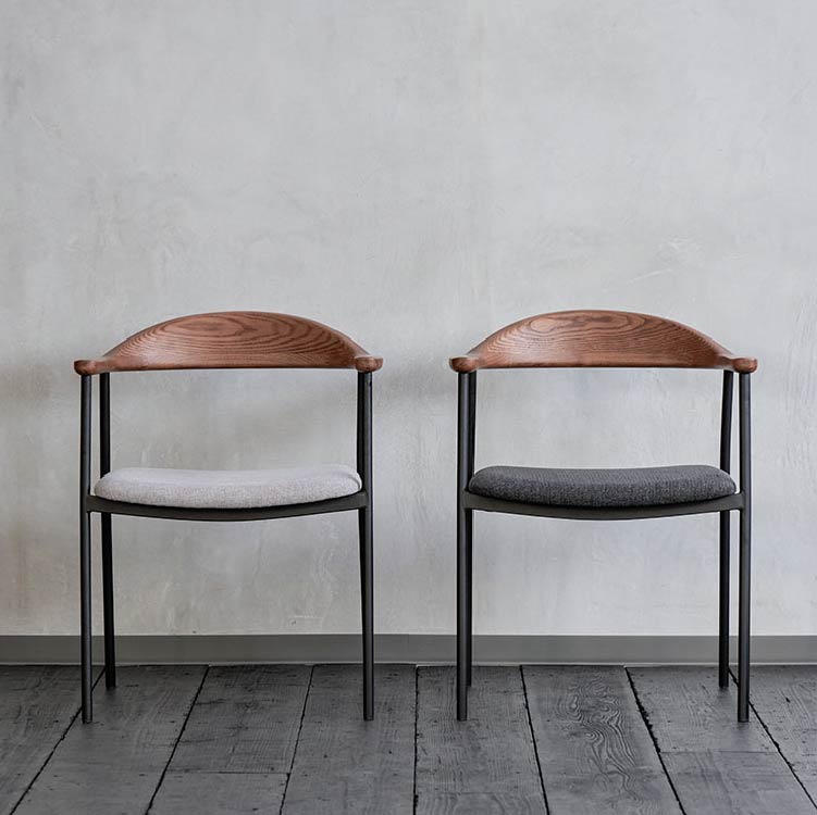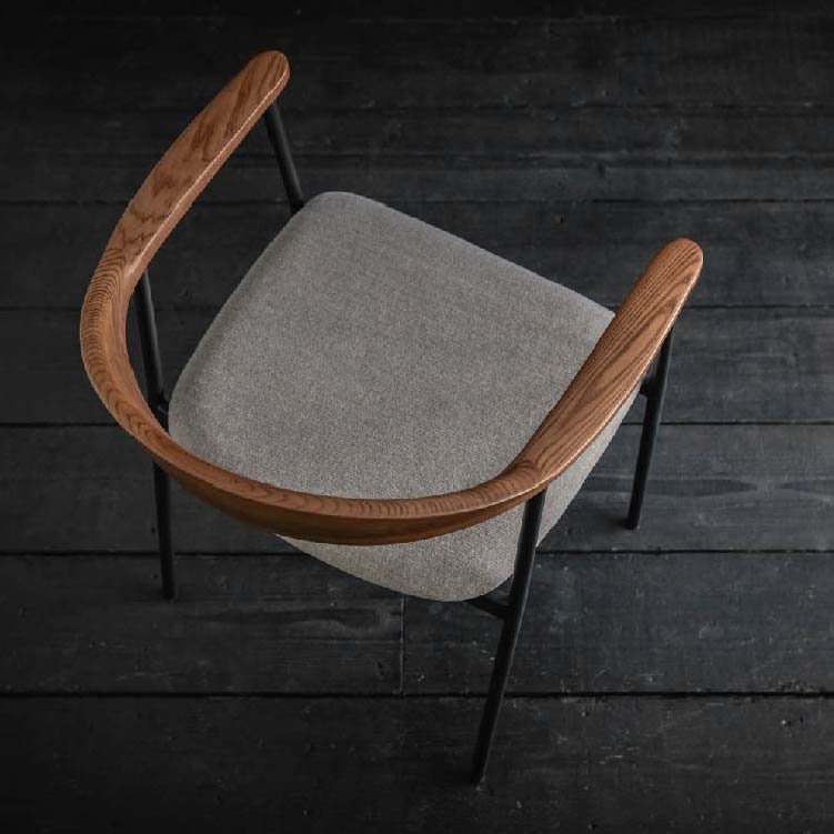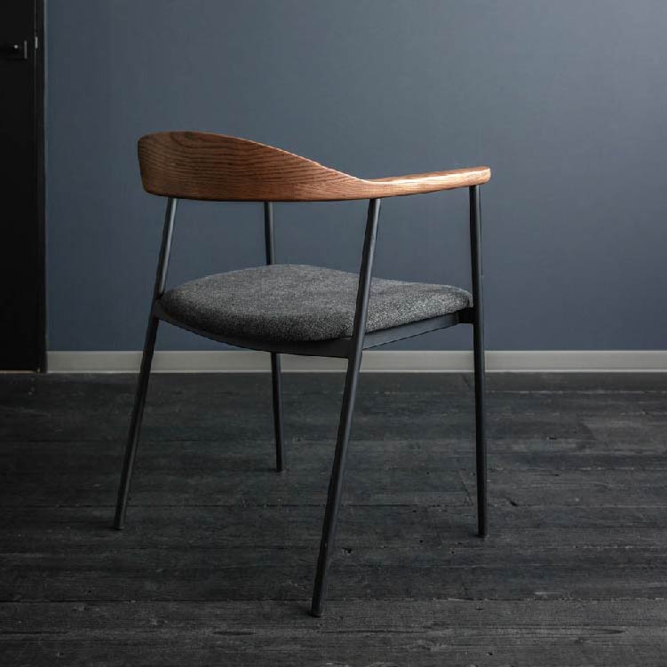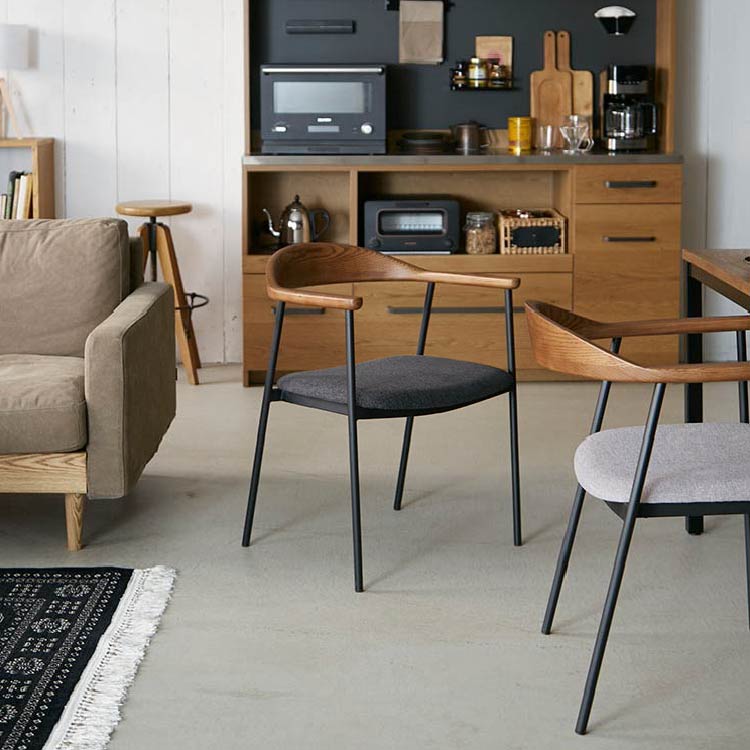 | 商品情報 | 背から肘にかけてなめらかな曲線を描く木部と、スチールフレーム、ファブリックの異素材の組み合わせが個性的なチェア。無駄をそぎ落とし洗練されたフォルムに、優しい天然木の雰囲気が見事に調和しています。 |