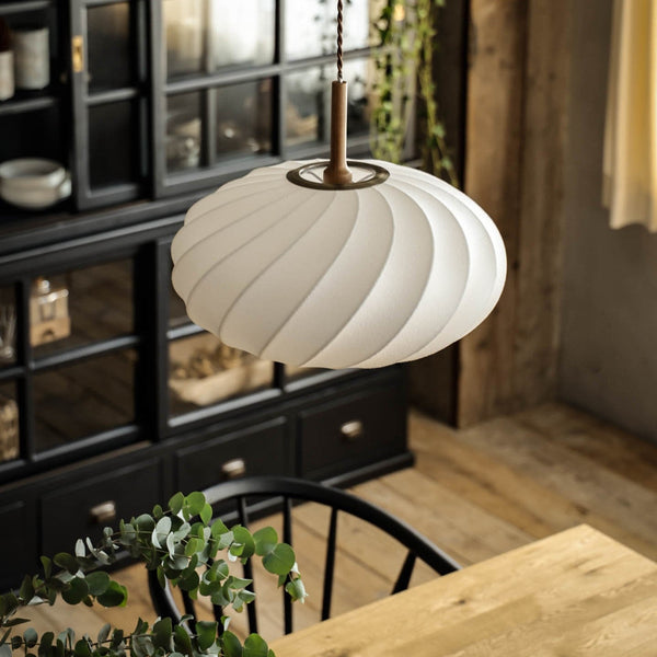 | 商品情報 | 和紙にも似た弾力のある生地が人気のFalkペンダントライトの新型。緩やかなカーブのついたオーバルシルエットに普遍的な美しさを感じます。流れるような螺旋模様を描く細いワイヤーフレームにファイバーをスプレーで吹きつけて作られています。シェード全体が柔らかく光る様は日本の住宅にも合わせやすく、和モダンな空間づくりにもおすすめです。 LED電球:対応可 |
