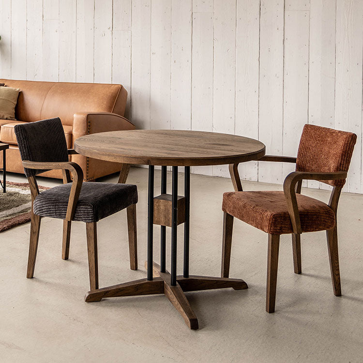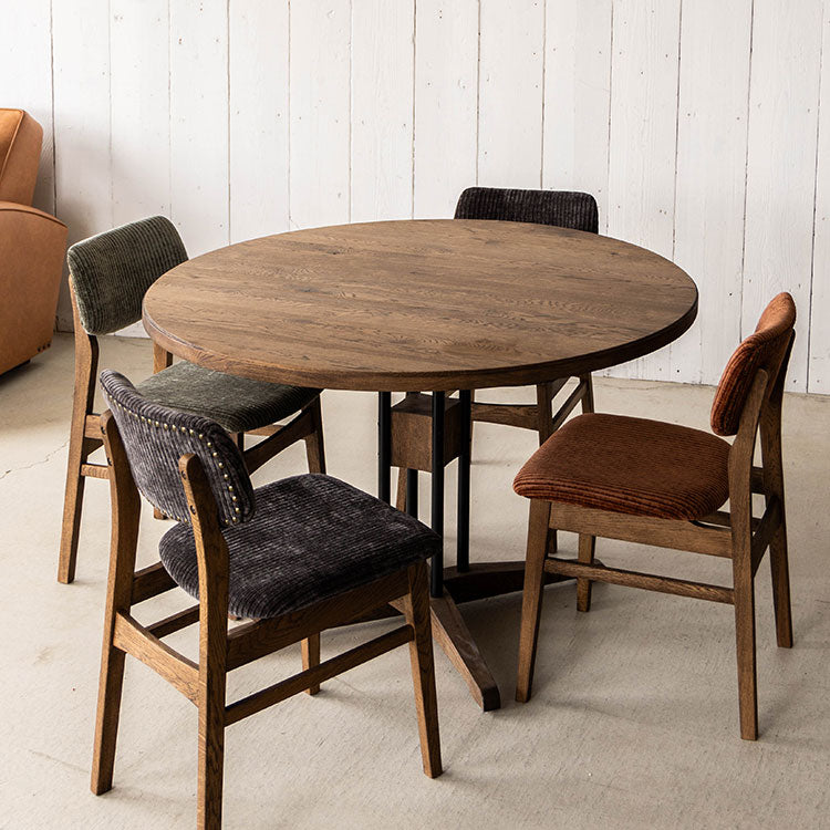 | 商品情報 | 木部は落ち着きの感じられるミディアムブラウンで木目を際立たせる塗装や、緑に彫りを施した天板が特徴のダイニングテーブル。 木とスチールの異素材を組み合わせることにより重厚感のあるヴィンテージライクな風合いに仕上げています。 |