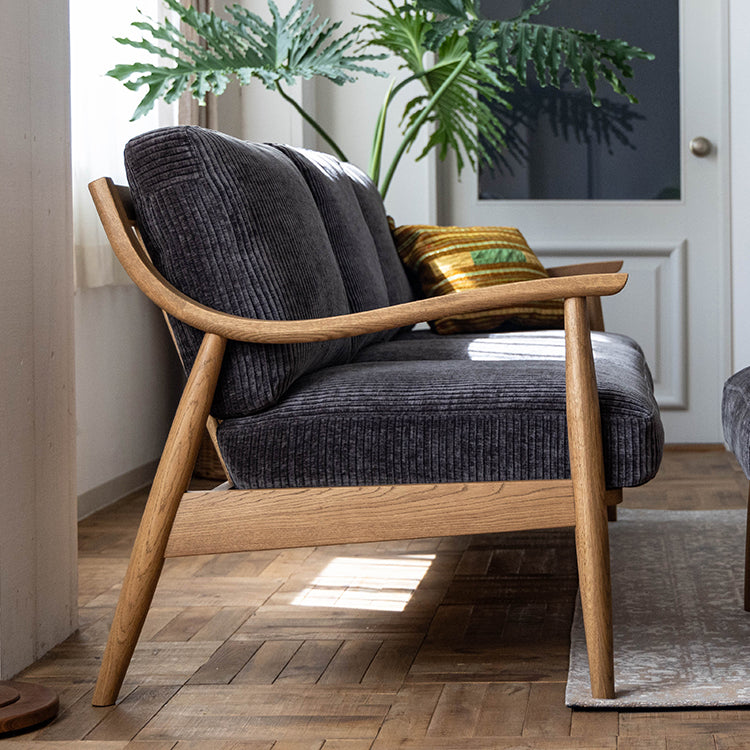 | 商品情報 | 肘を置くと絶妙にフィットする曲線のアームが美しい木製ソファ です。肘を置いた時に絶妙にフィットするように設計しています。 F型モデルは通常仕様とは異なり、生地の厚みを活かしたダフ 感のある柔らかい座りが特徴です。 |