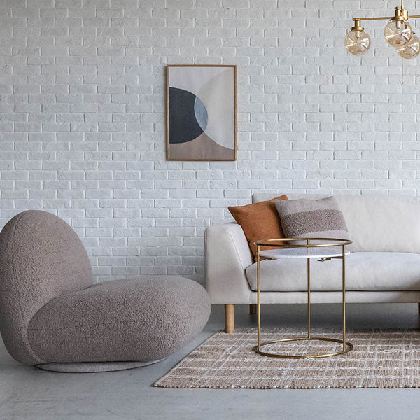 | 商品情報 | 丸みのある可愛らしいフォルムの回転ソファ。座面が低く、リラックスした姿勢でくつろげます。柔らかく心地よい肌触りのループ状のブークレ生地を使用しています。 |